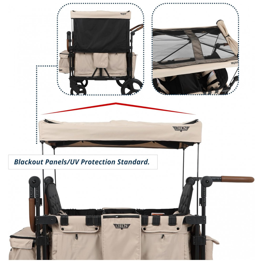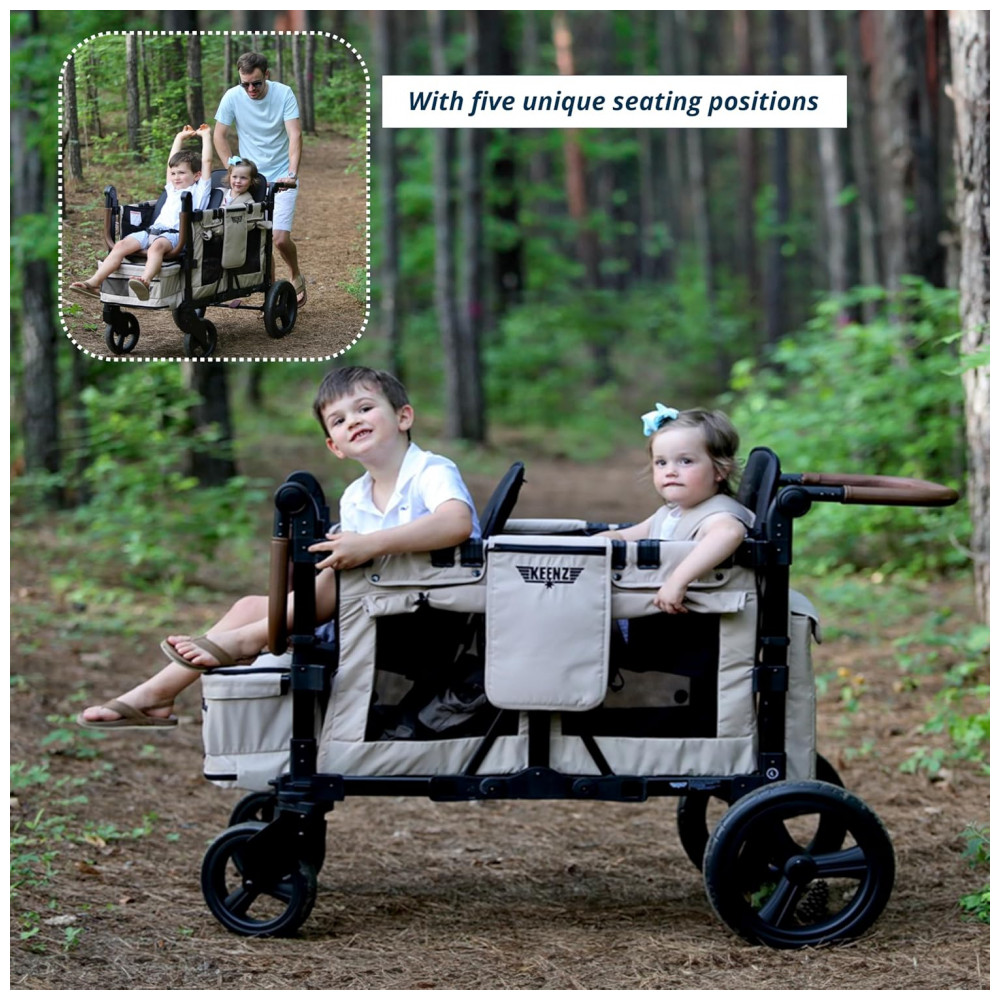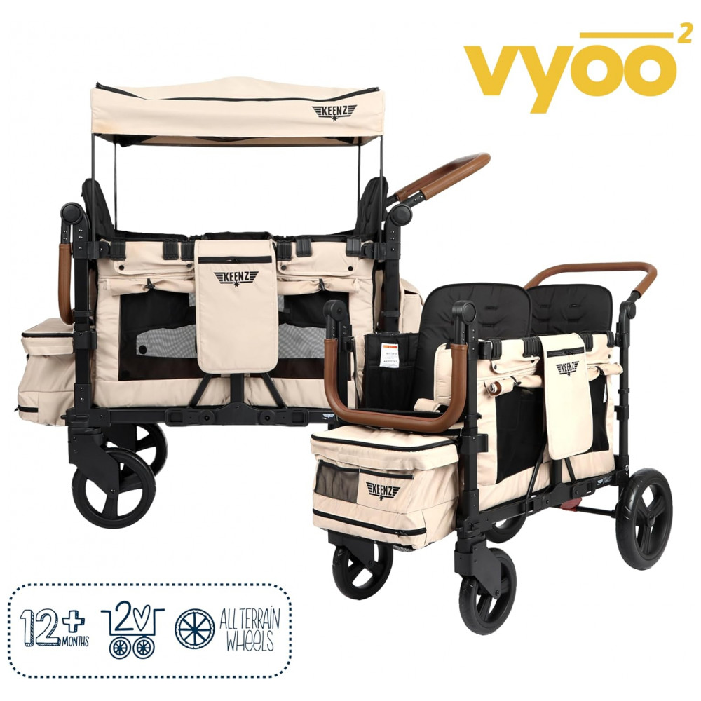 Carrinho de passeio dupla Keenz VYOO marrom oferece 5 posições dinâmicas de assentos (frente a frente, costas com costas, voltadas para fora) para 2 crianças, ideal para interações sociais ou explorações em passeios familiares. Estrutura em alumínio com rodas de 36 cm em borracha e dimensões 100 x 57 x 128 cm proporciona manobrabilidade em diversos ambientes.