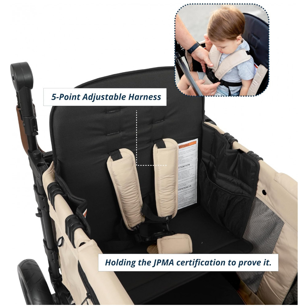Cintos de 5 pontos com 1 suporte para copo e freio integrado. Cobertura em poliéster 100% ajustável para proteção solar.