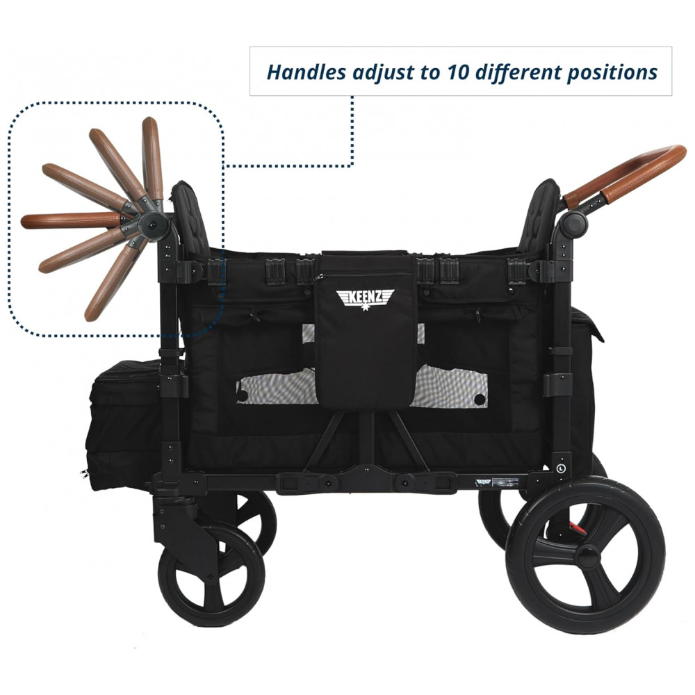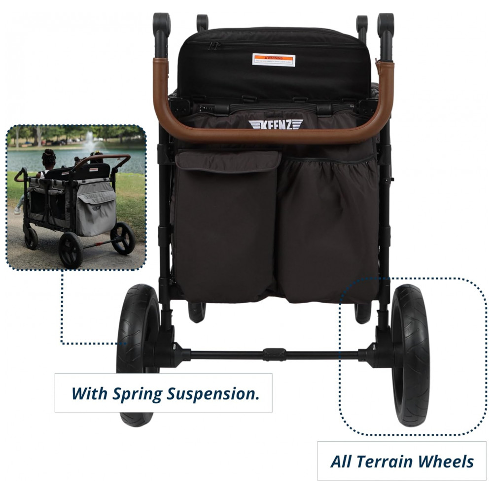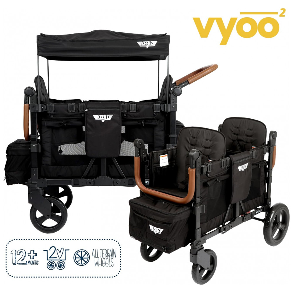 Carrinho de passeio dupla Keenz VYOO preto para 2 crianças com 5 posições de assentos (frente a frente, costas com costas, voltadas para fora), suspensão em 4 rodas para mobilidade todo terreno em calçadas ou trilhas de parque. Armazenamento ventilado para sapatos, bandeja para lanches com 1 suporte para copo, bolsos zipados e espaço sob assentos.