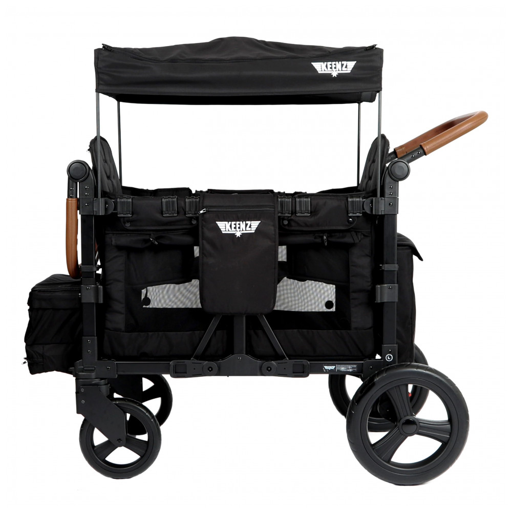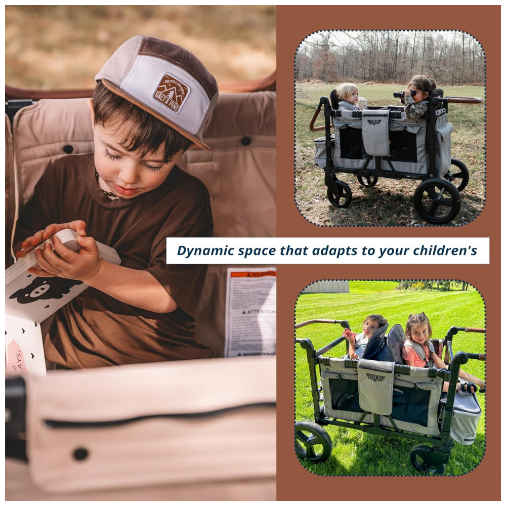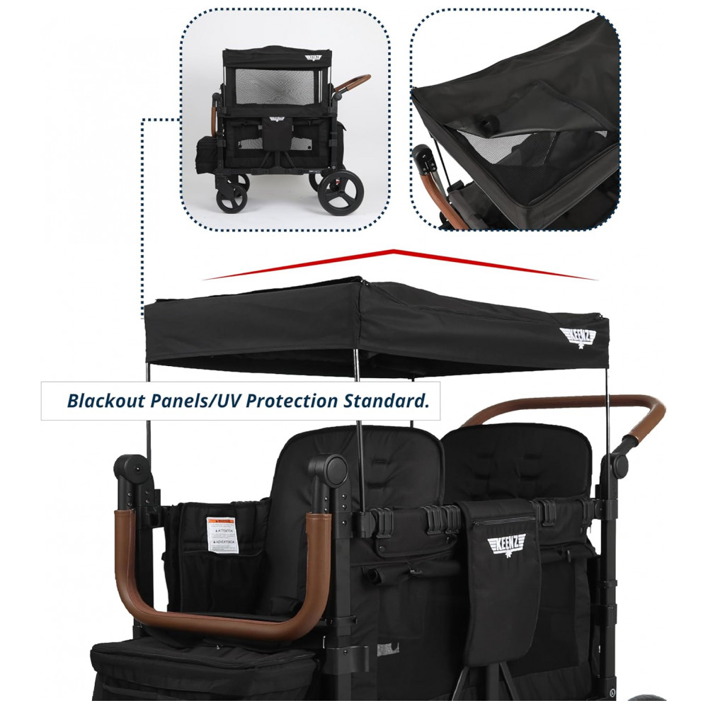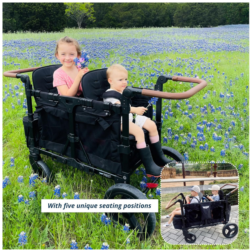 Carrinho de passeio dupla Keenz VYOO preto para 2 crianças com 5 posições de assentos (frente a frente, costas com costas, voltadas para fora), suspensão em 4 rodas para mobilidade todo terreno em calçadas ou trilhas de parque. Armazenamento ventilado para sapatos, bandeja para lanches com 1 suporte para copo, bolsos zipados e espaço sob assentos.