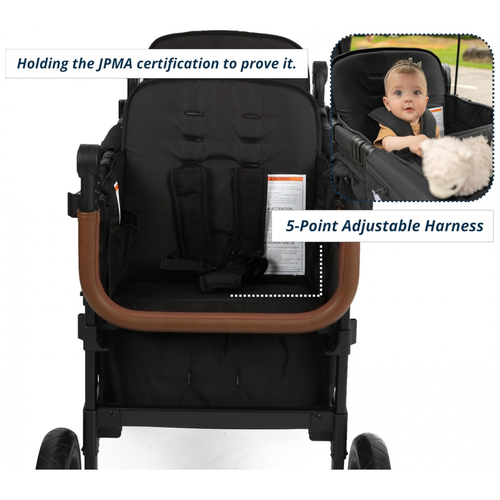 Cintos ajustáveis duplos de 5 pontos e freio de pé para segurança. Cobertura em poliéster com painéis blackout e proteção SPF.