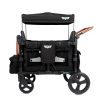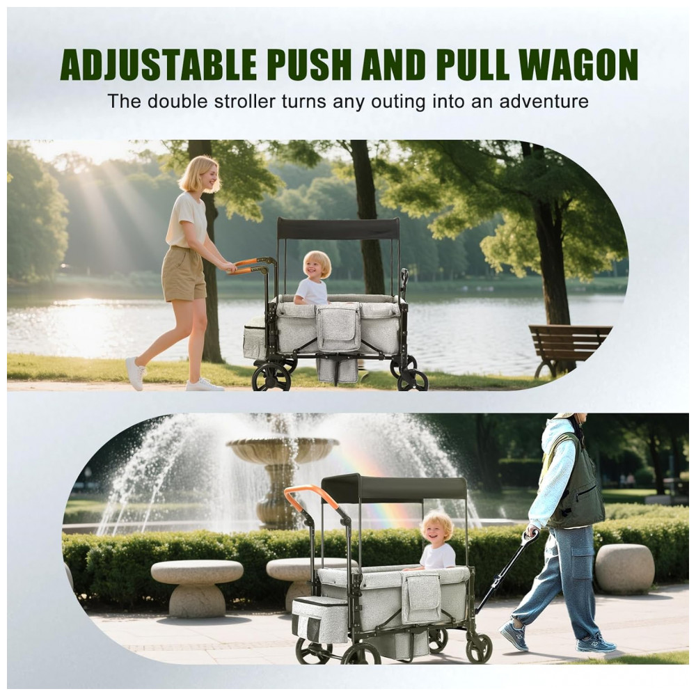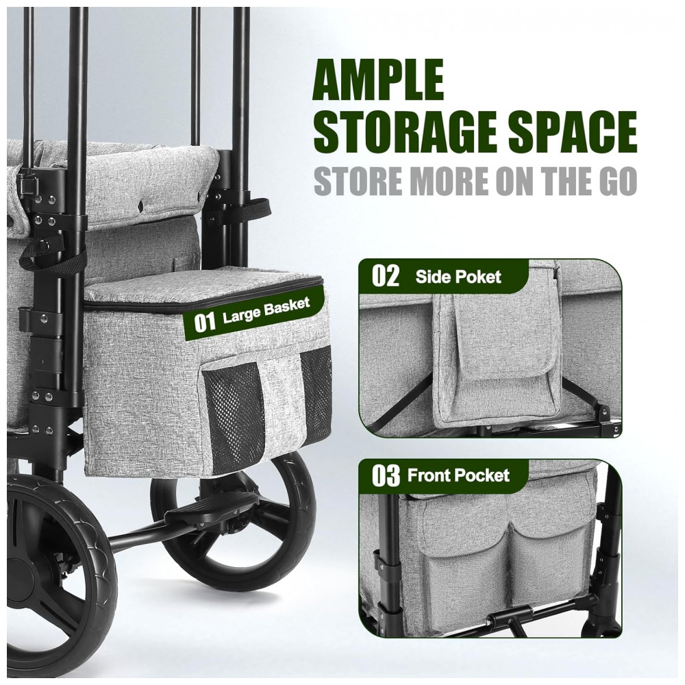 Carrinho de passeio dupla SAFETY CAREYA cinza opera em modo 3 em 1: empurrar, puxar ou dobrável, com poço retrátil para pés e capacidade total de 90,7 kg para atividades outdoor como acampamentos ou parques. Estrutura em alumínio pesa 12,7 kg para agilidade no transporte, com rodas todo terreno pneumáticas de giro e sistema de absorção de choque.