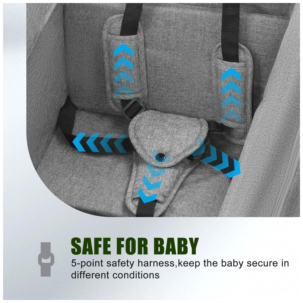 Assentos acolchoados em espuma com cinto de 5 pontos e capa protetora evitam liberação acidental. Freio de um passo para parada em terrenos diversos; compartimentos organizam lanches, fraldas e garrafas.