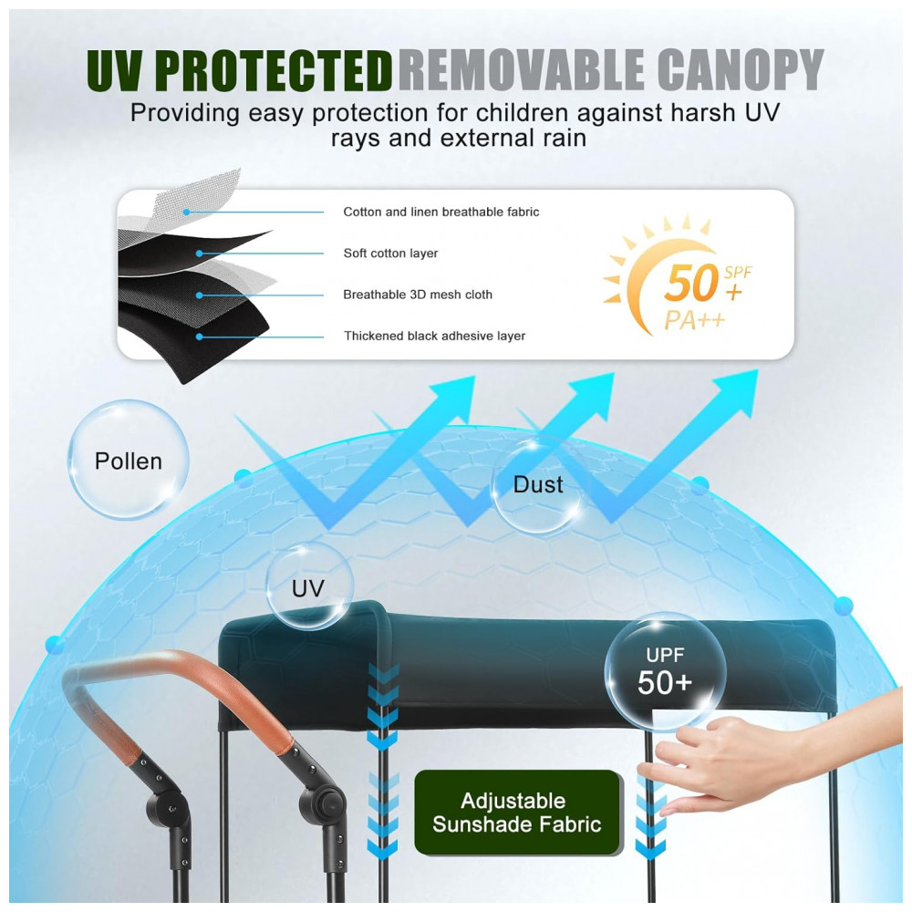 Cobertura ajustável em múltiplos ângulos adapta sombreamento à posição solar. Alças de empurrar e puxar com ajustes angulares atendem alturas variadas de usuários.