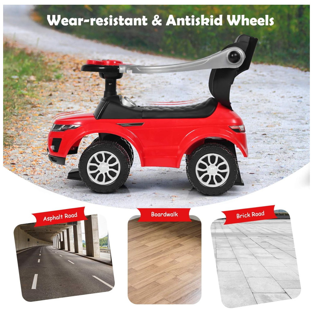 Alta Segurança: Apresentando uma alça removível e grades de segurança, o brinquedo 3 em 1 garante a segurança das crianças durante a condução. As rodas antiderrapantes e resistentes ao desgaste são adequadas para uma variedade de estradas planas, permitindo que seus bebês comecem sua própria aventura. Além disso, a placa anti roll pode efetivamente impedir que o carro tombe.