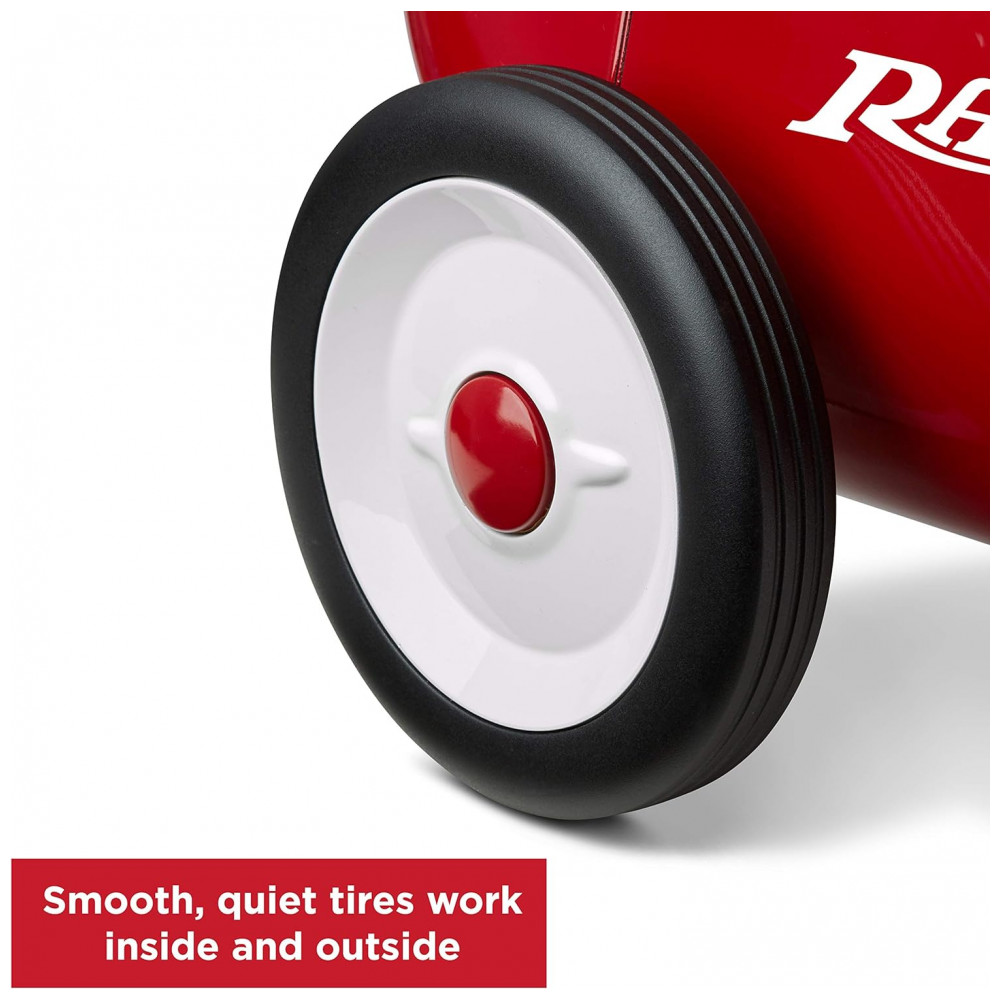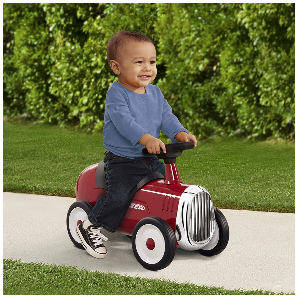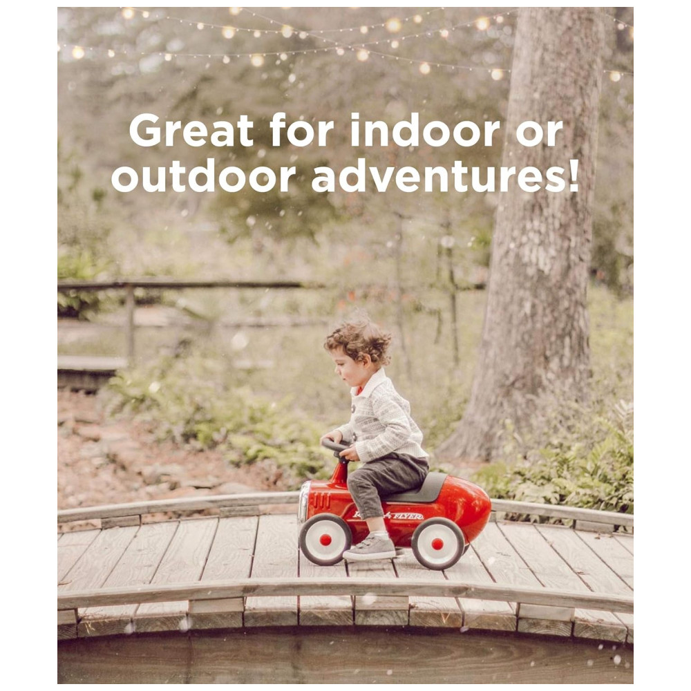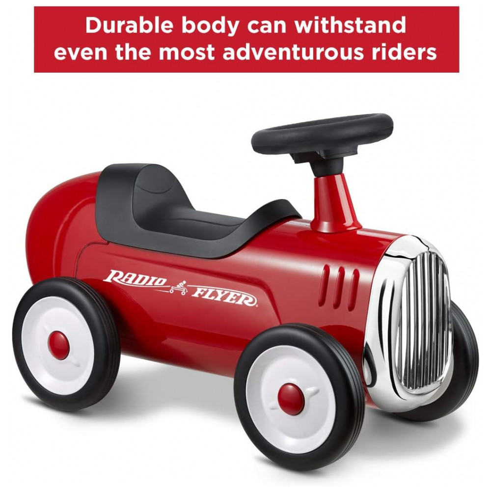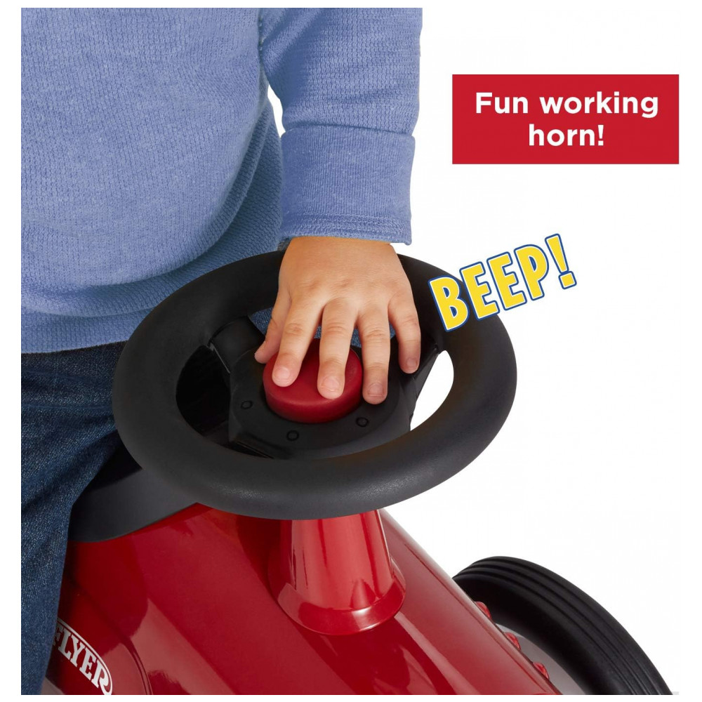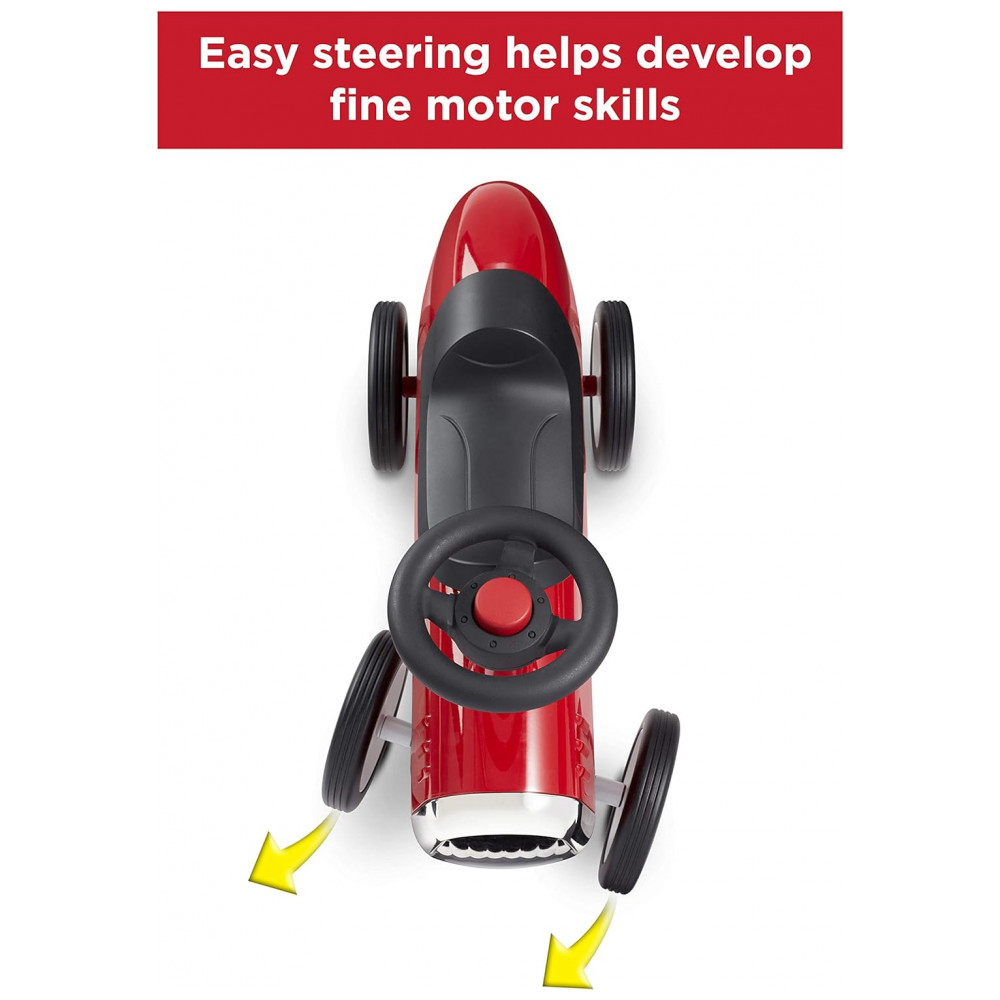 DESIGN CLÁSSICO: O design clássico do Little Red Roadster inclui uma carroceria de aço resistente, acabamentos cromados, direção funcional e buzina. Este passeio confiável durará anos.