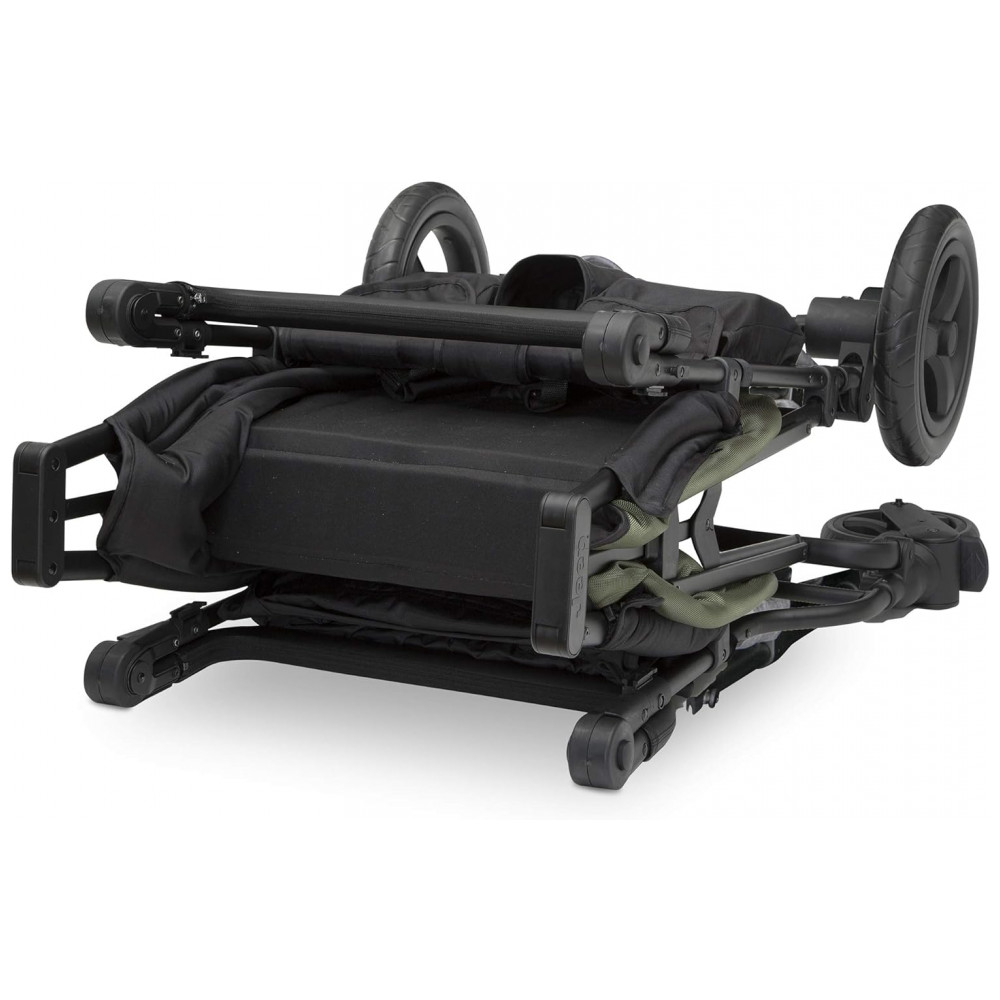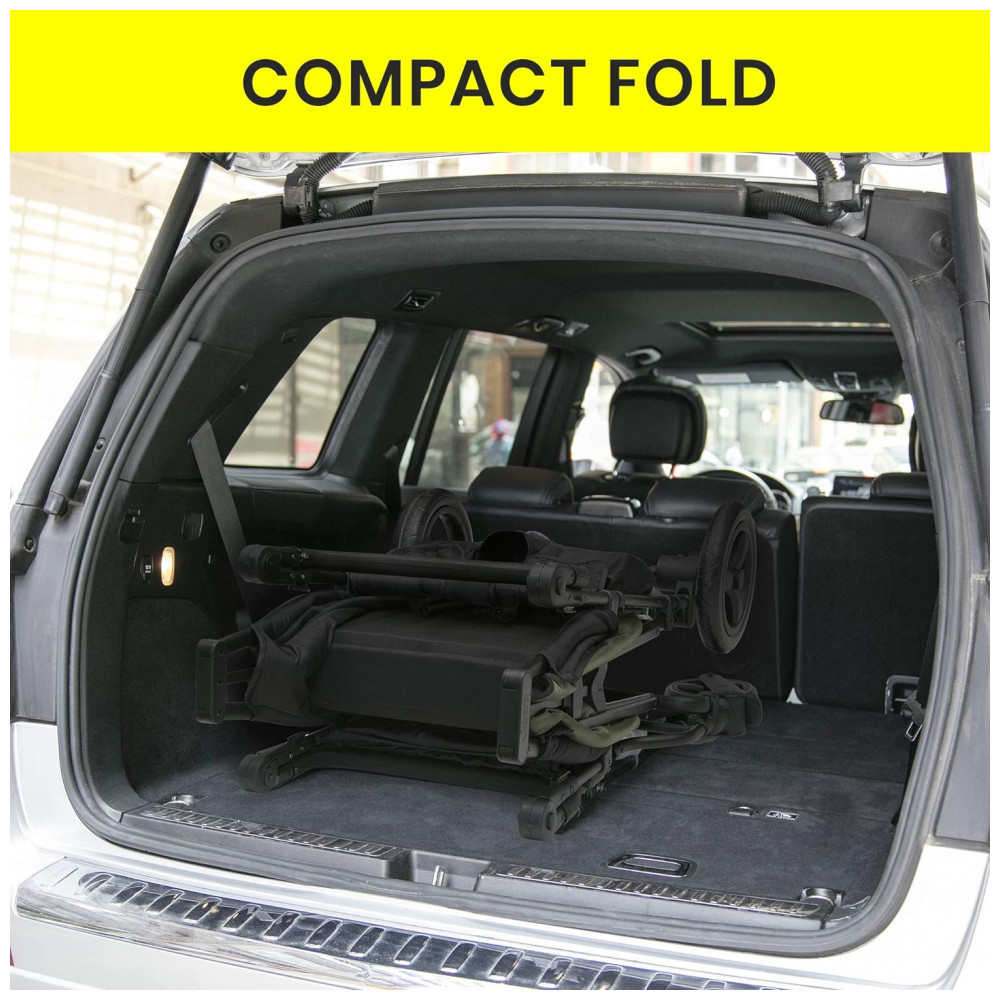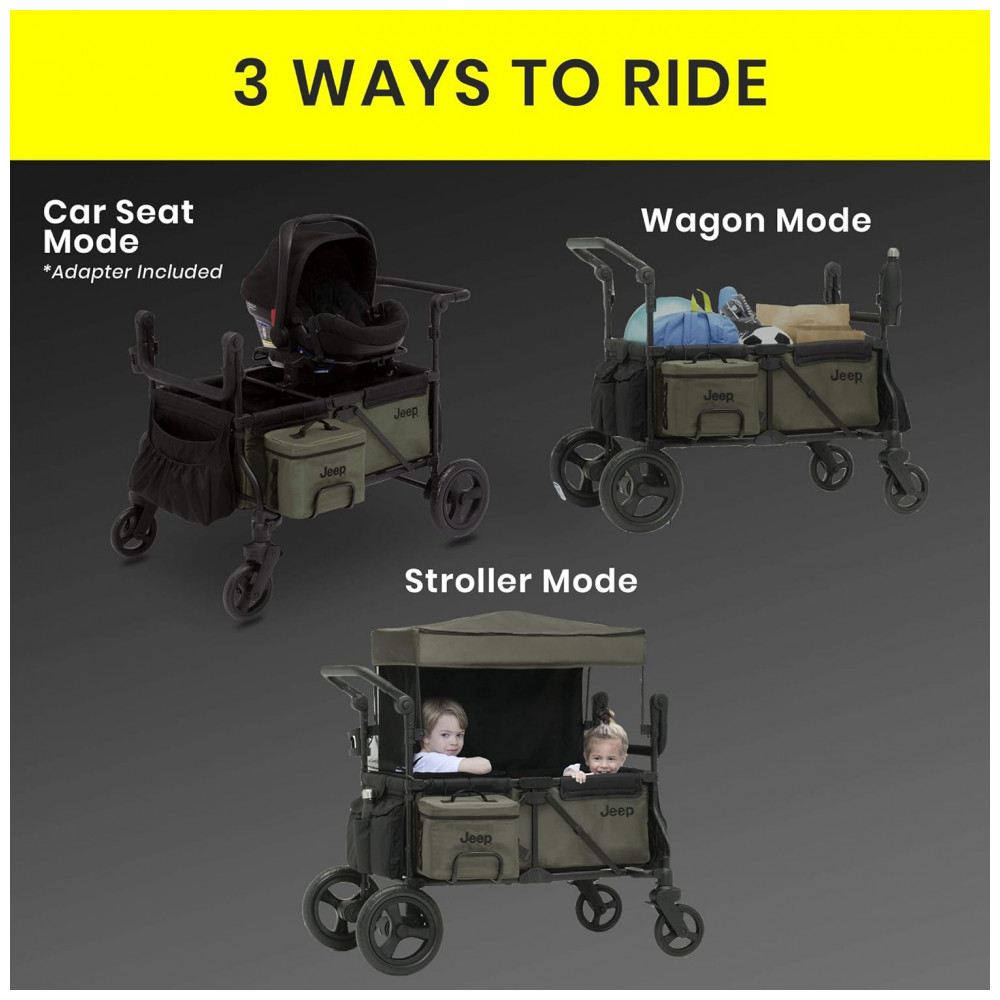 3 MANEIRAS DE ANDAR Modo de assento de carro Prenda o assento de carro com o adaptador incluído Modo Carrinho Use dois assentos de segurança de 5 pontos para crianças mais velhas Modo Vagão Transporte todo o seu equipamento para qualquer atividade Dobra compacta e trava automática para fácil transporte, zenamento.