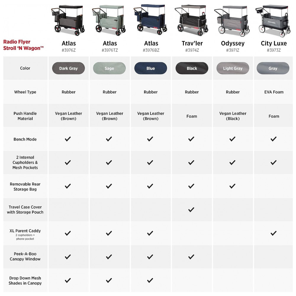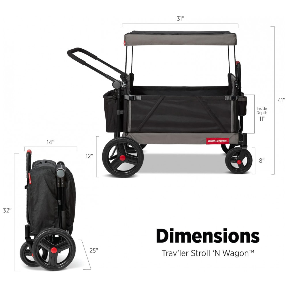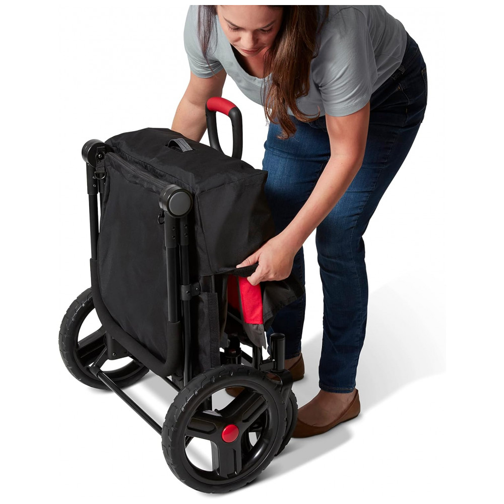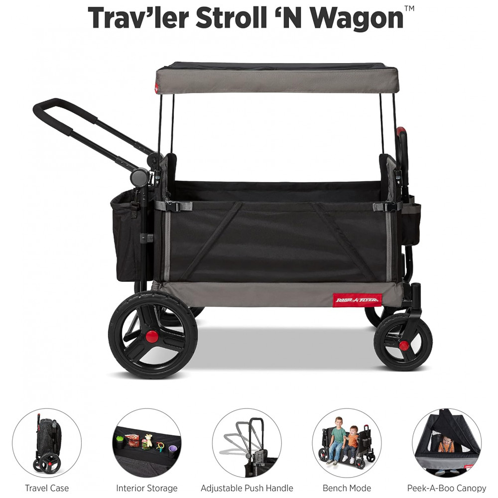 PUSH PULL O Trav ler Stroll N Wagon permite que você puxe como um vagão ou empurre para maior comodidade em um veículo. Possui uma alça de puxar de vagão NeverFall na frente e um guidão dobrável na parte de trás.