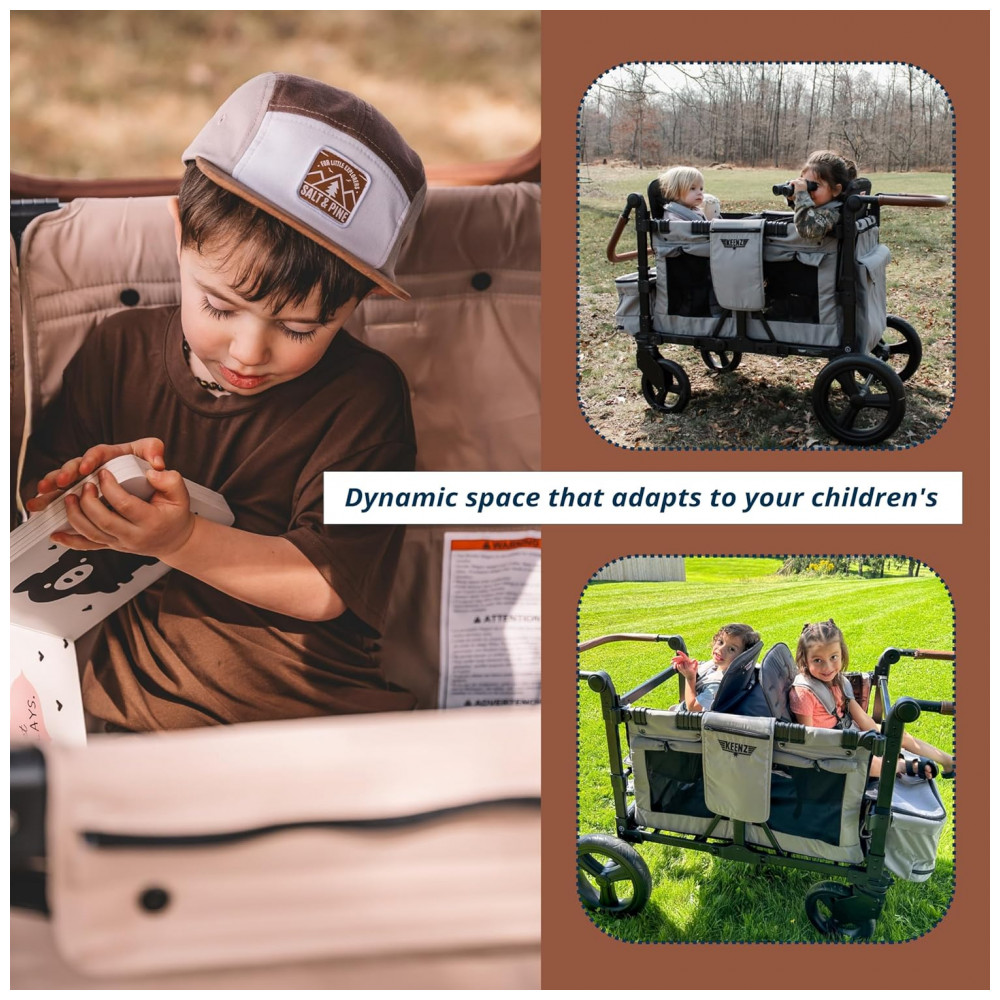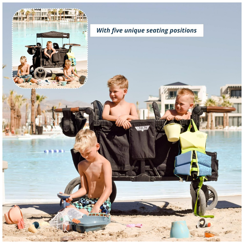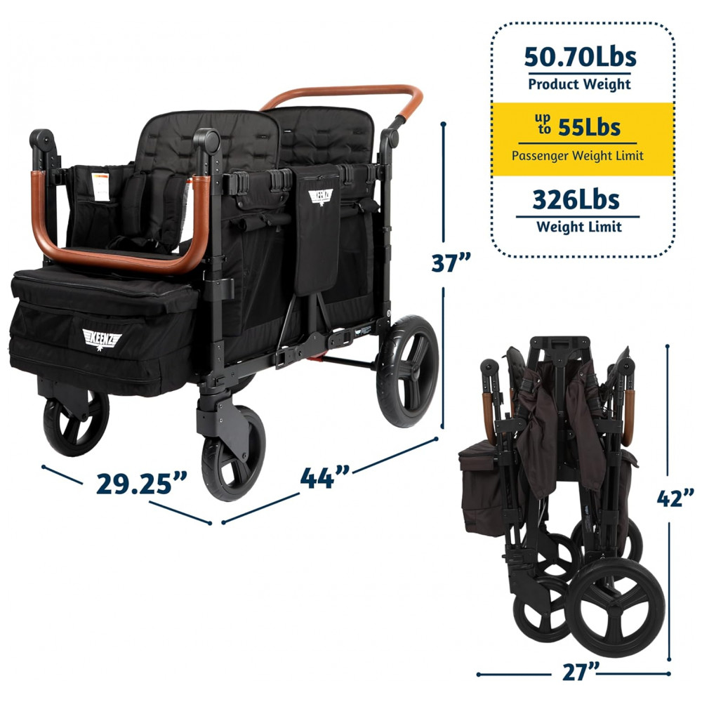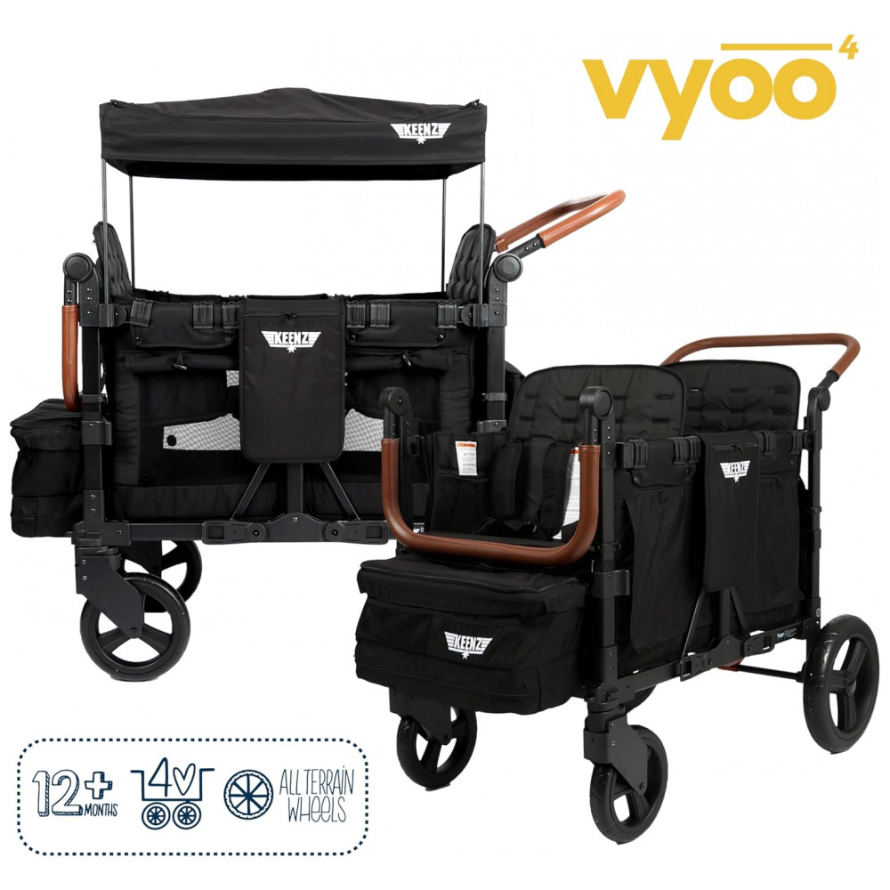 Carrinho de passeio quadrúplo Keenz VYOO preto oferece 5 configurações de assentos para 4 crianças, com mobilidade todo terreno em grama, cascalho e pavimento para passeios familiares, explorações ou saídas diárias. Estrutura em alumínio com rodas de 36 cm de diâmetro em borracha garante estabilidade e manobrabilidade em superfícies variadas.