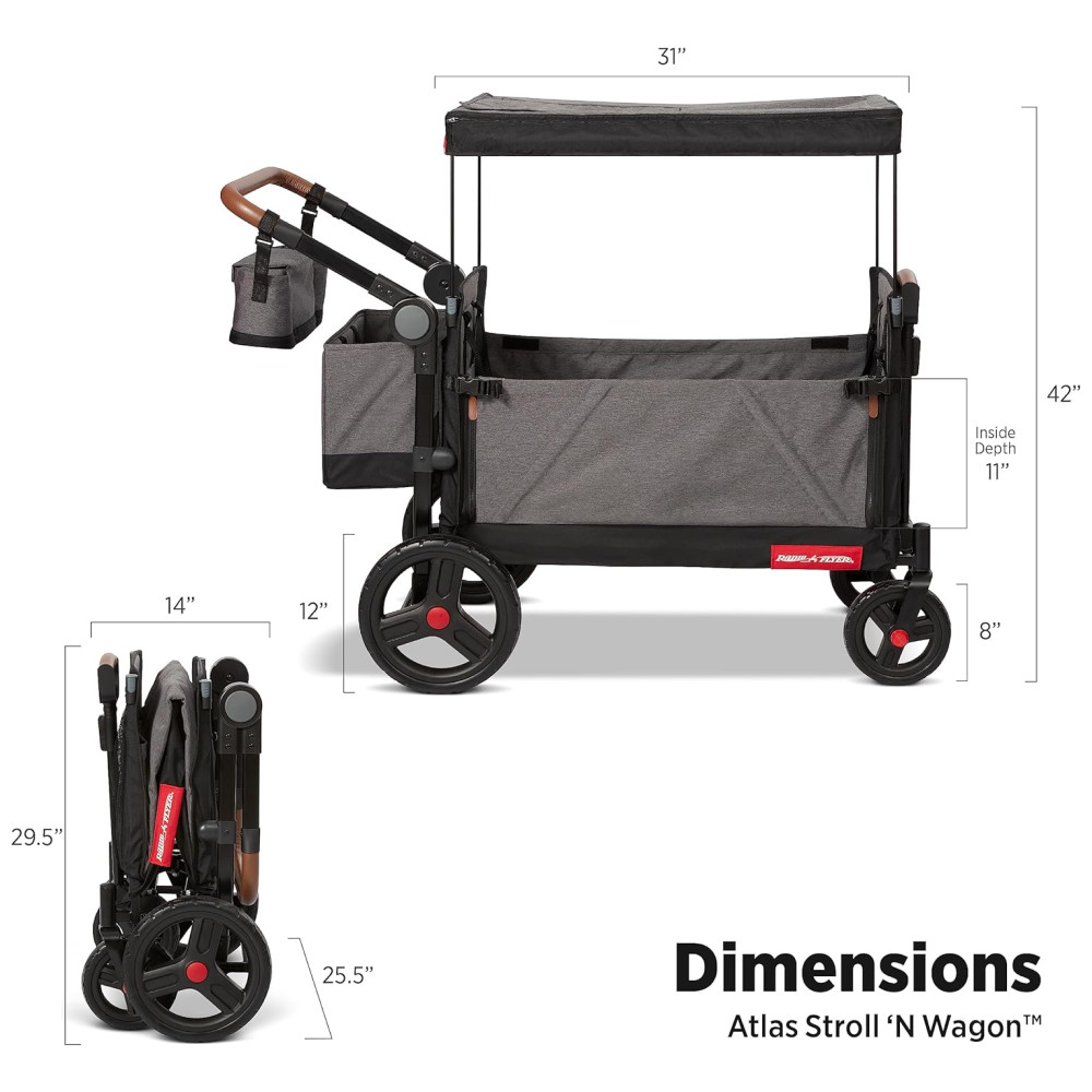 O Atlas Stroll N Wagon é um vagão versátil que oferece 3 modos diferentes de assento para dois passageiros: transporte e assento corrido. Ele possui uma alça de puxar NeverFall na frente e um guidão dobrável e ajustável com uma alça de couro vegano premium na parte traseira. As rodas de borracha com rolamentos proporcionam um passeio suave. O porta-pais XL incluso possui 2 porta-copos isolados, uma bolsa de armazenamento com zíper para manter pequenos itens seguros e um compartimento central com tampa magnética. A bolsa de armazenamento traseira funciona como uma bolsa conveniente com alças quando removida do vagão.