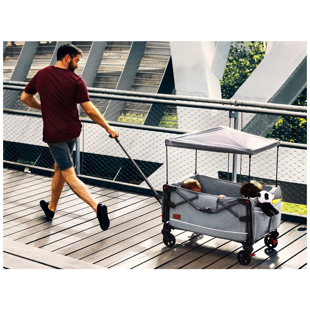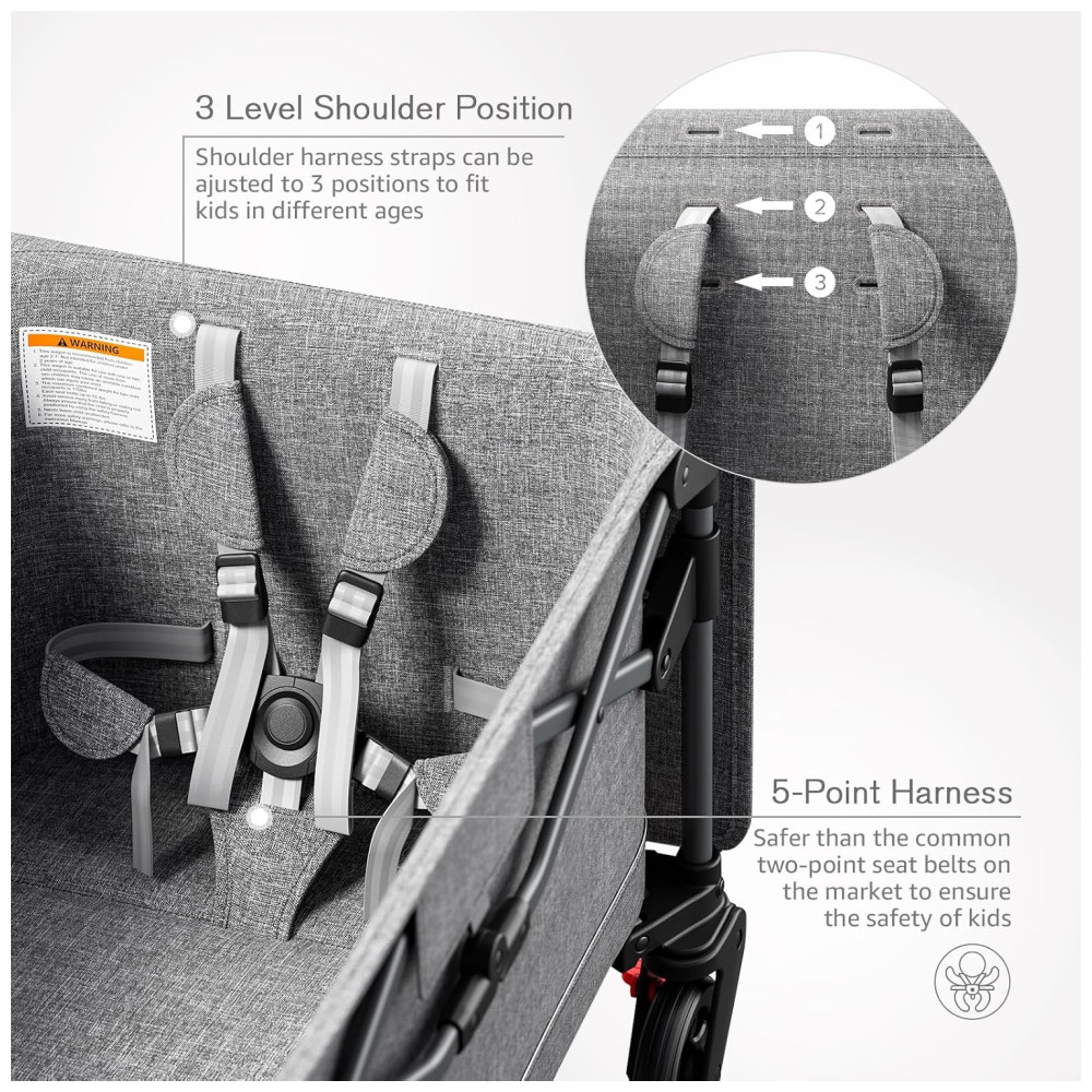 Projetado com um arnês de 5 pontos, o carrinho wagon oferece máxima tranquilidade e conforto para as crianças. Fabricado com tecido premium de poliéster 300D e uma estrutura de aço resistente, pode suportar até 49 cm (24 kg por assento). O dossel removível, com proteção UV 50+ e faixa reflexiva, proporciona sombra e segurança adicional. Equipado com freios de um passo em todas as rodas, o carrinho garante controle total da direção. Certificado pela JPMA e em conformidade com os padrões ASTM, garantindo a máxima segurança.