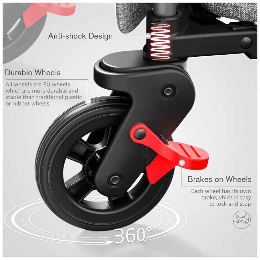 Quatro rodas de PU todo-terreno atualizadas, com sistema anti-choque, oferecem movimento suave e sem atrito, enquanto as rodas dianteiras giratórias 360° e suspensão em todas as rodas garantem excelente mobilidade em diversos terrenos.