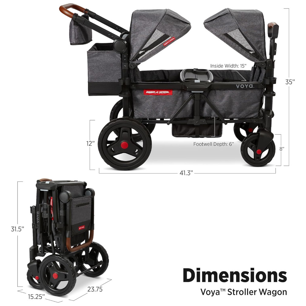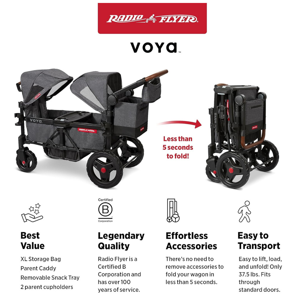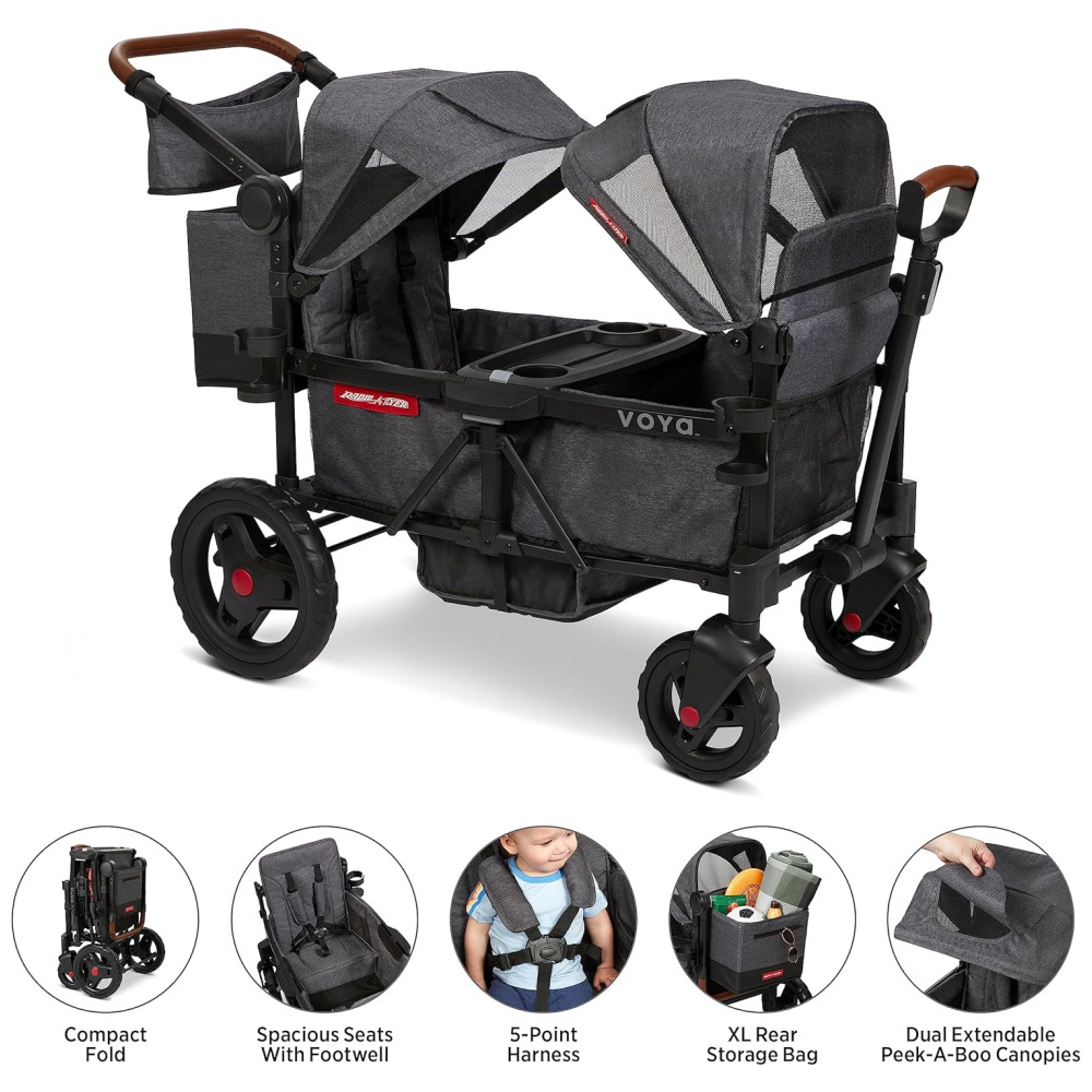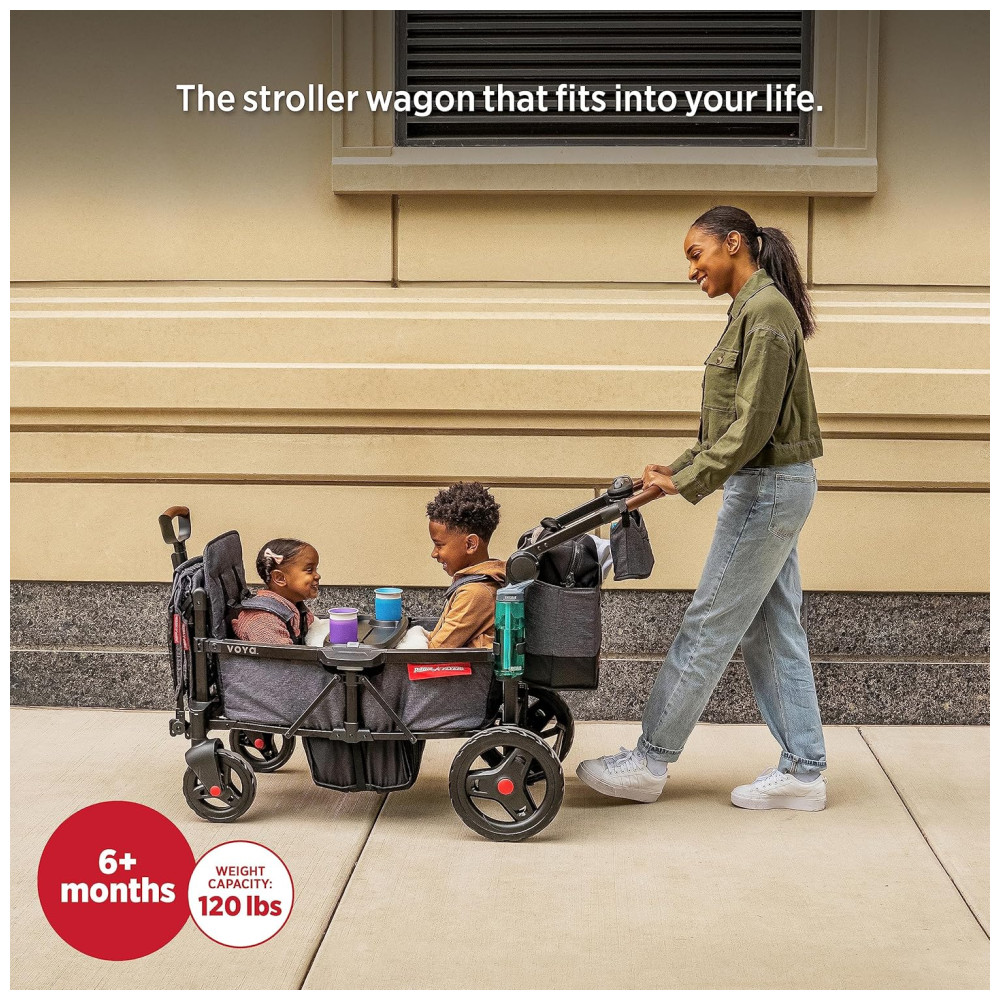Carrinho de Passeio Vagão Duplo com 2 Assentos Altos e Dossel UV Ajustável Radio Flyer Voya Cinza