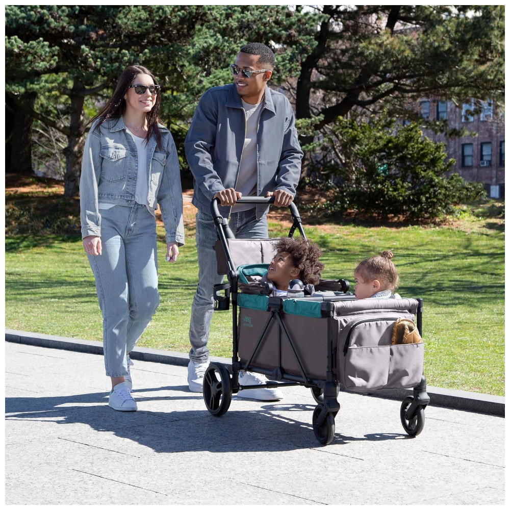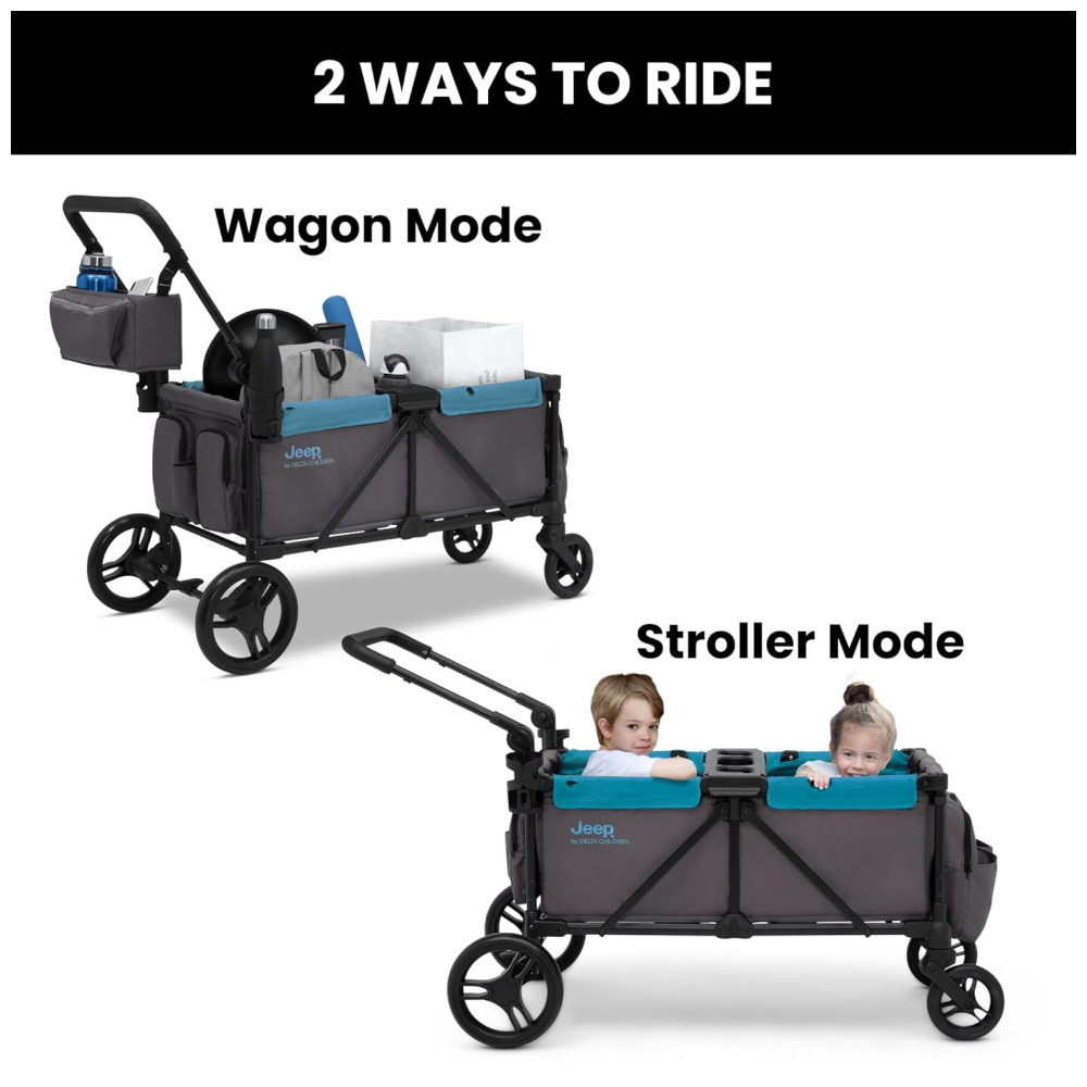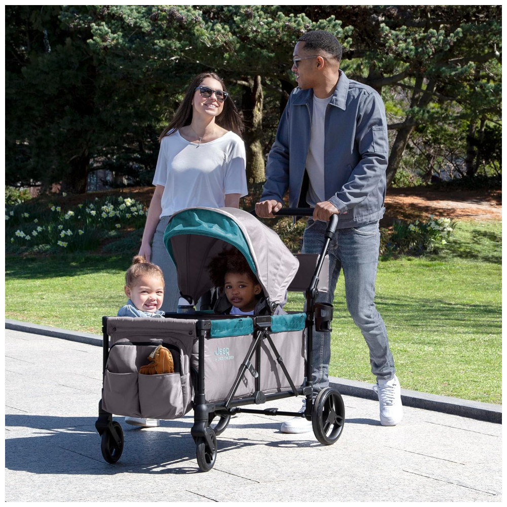 O Jeep Sport AllTerrain Stroller Wagon da Delta Children é a escolha perfeita para famílias que adoram aventuras. Este vagão versátil e espaçoso é confortável para irmãos ou amigos e possui uma capota ajustável com guarda-sol extensível para proteger as crianças das intempéries. Com um guidão ajustável em couro sintético, você pode empurrar ou puxar o vagão com facilidade. O vagão também possui muito espaço de armazenamento por dentro e por fora, incluindo uma bolsa expansível, vários bolsos, organizador para os pais, dois porta-copos para os pais e uma bandeja plástica para crianças com compartimentos para lanches e bebidas.