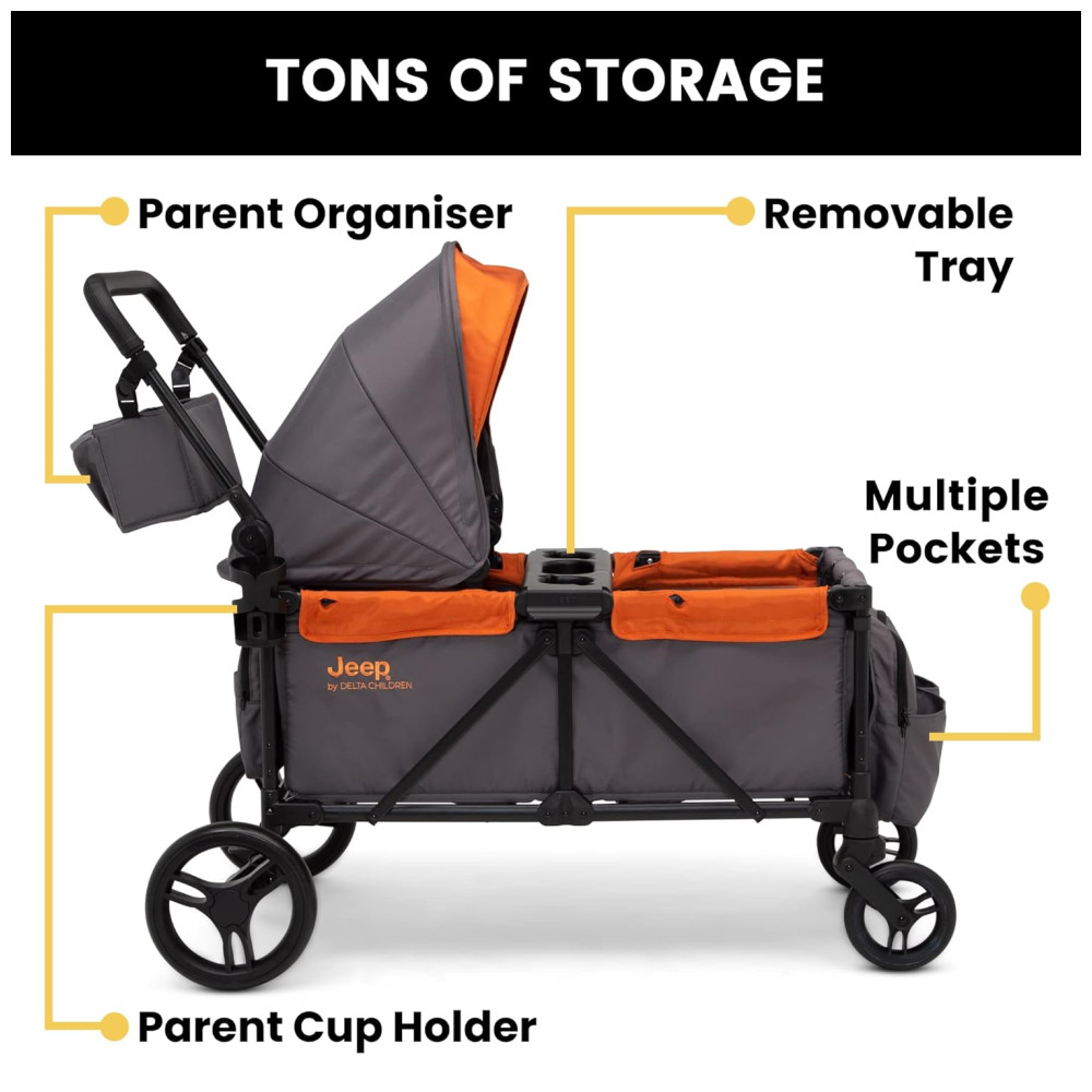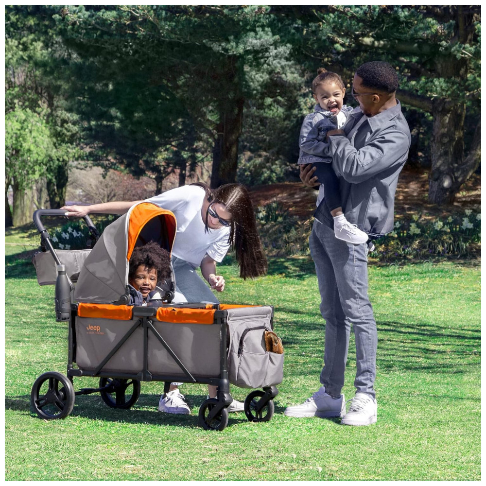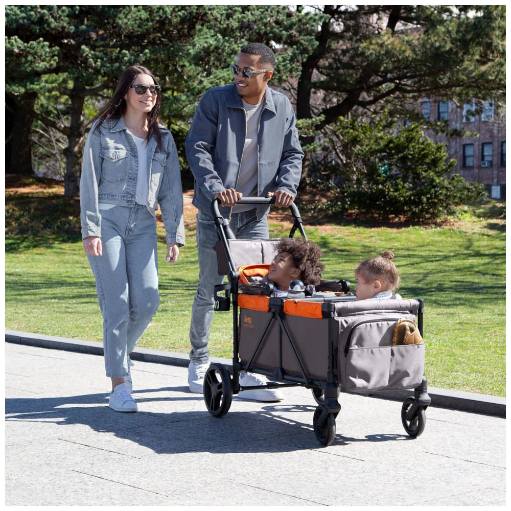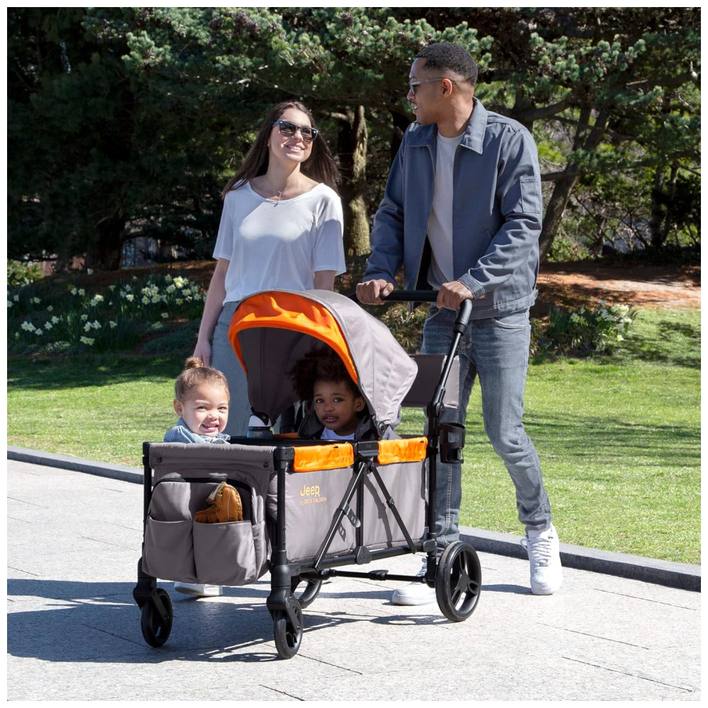 Carrinho de Passeio Vagão Duplo Multifuncional com Capota e Armazenamento Jeep Cinza e Laranja
