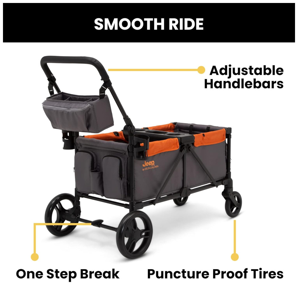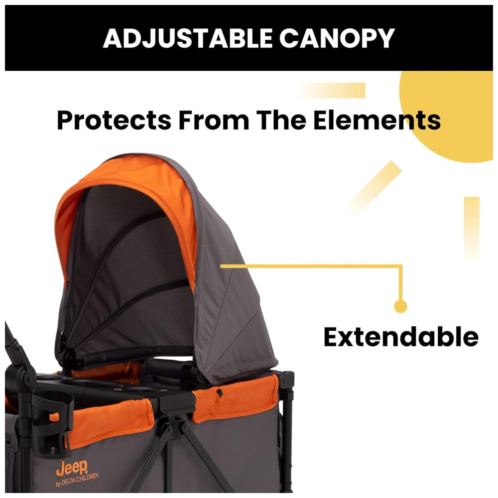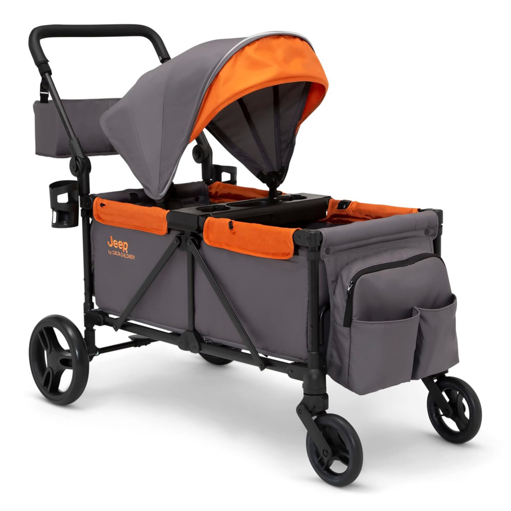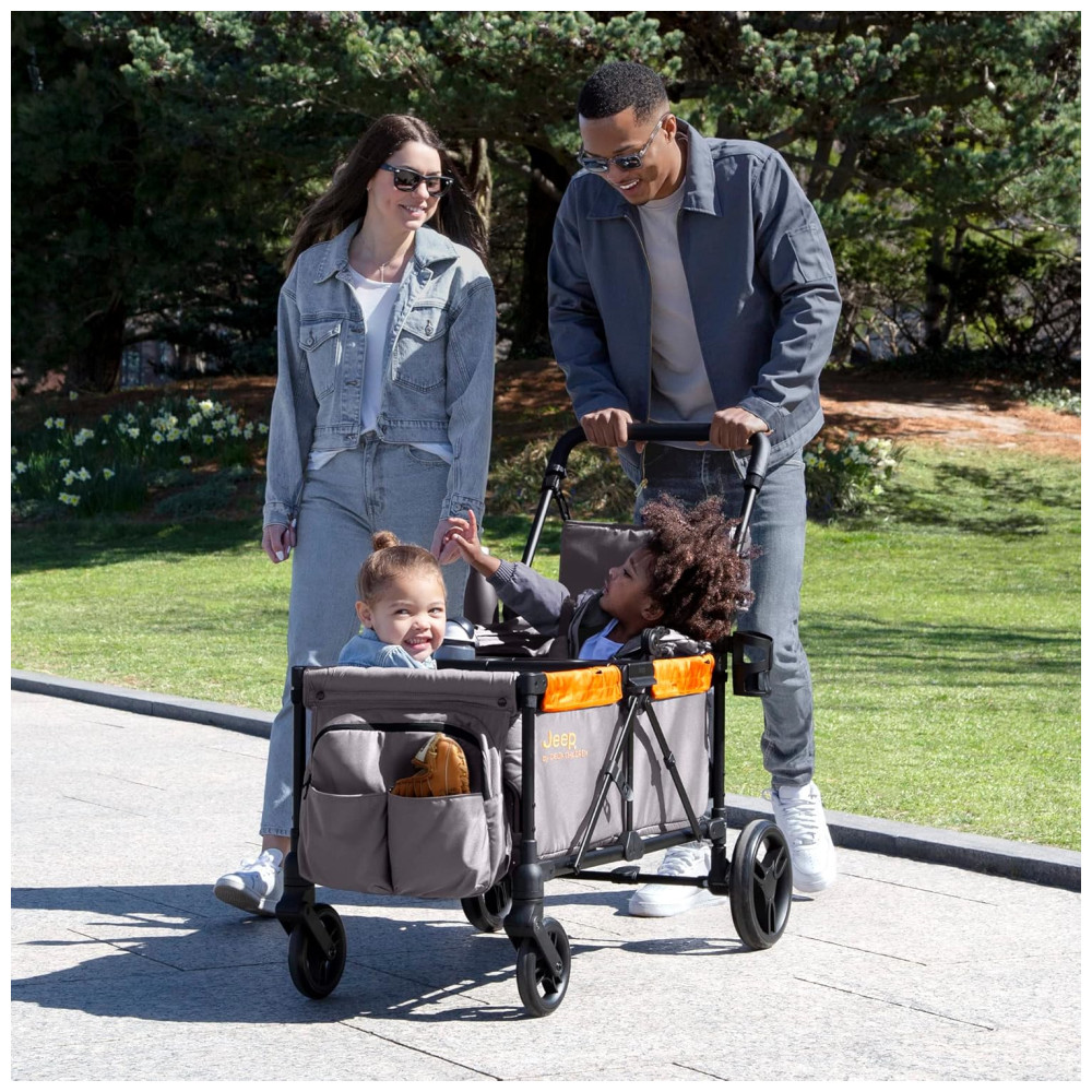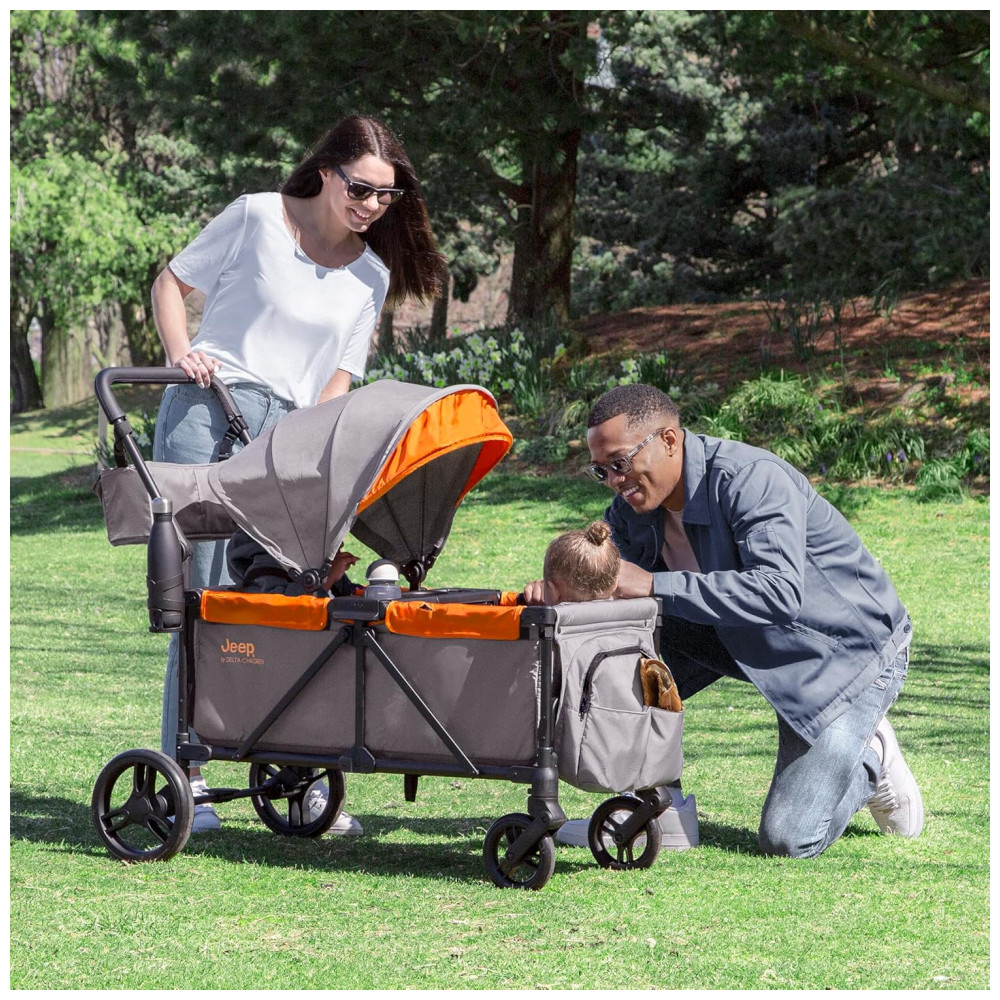 Carrinho de Passeio Vagão Duplo Multifuncional com Capota e Armazenamento Jeep Cinza e Laranja