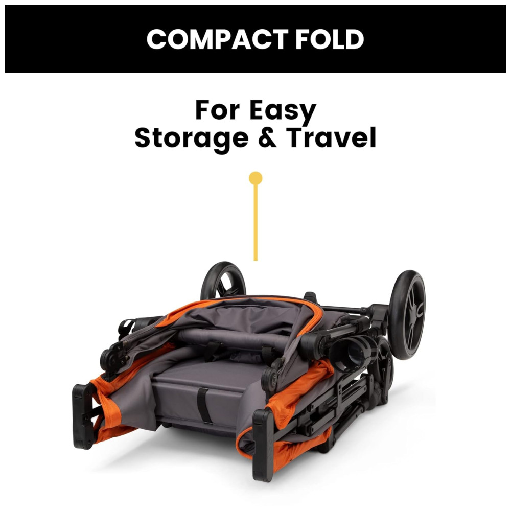 As rodas dianteiras de 6 polegadas à prova de furos e as rodas traseiras de 10 polegadas com absorção de choque proporcionam uma viagem suave, enquanto o freio de pé traseiro de um passo garante controle máximo. A estrutura de aço resistente e resistente à ferrugem garante uso duradouro. O carrinho de passeio JPMA é certificado, e as almofadas de assento são laváveis na máquina. O vagão tem as seguintes dimensões: montado 109,98 cm x 46,00 cm x 109,98 cm com capota e dobrado 52,07 cm x 29,97 cm x 77,98 cm.