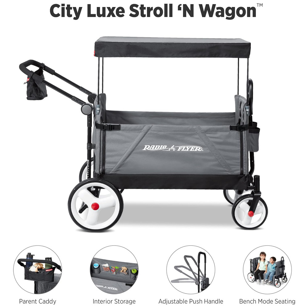 O modelo City Luxe Stroll N Wagon e um veiculo de passeio confortável e luxuoso para crianças. Com a opção de puxar como uma carroça ou empurrar para maior comodidade, este veiculo e perfeito para aventuras com seus filhos. Possui um design exclusivo que permite a configuração da direção em dois modos alça de puxar na frente e guidão dobrável na parte traseira. As grandes rodas traseiras de 12 EVA proporcionam um passeio suave em superfícies pavimentadas, suportando uma capacidade máxima de peso de 54,42 quilos.
