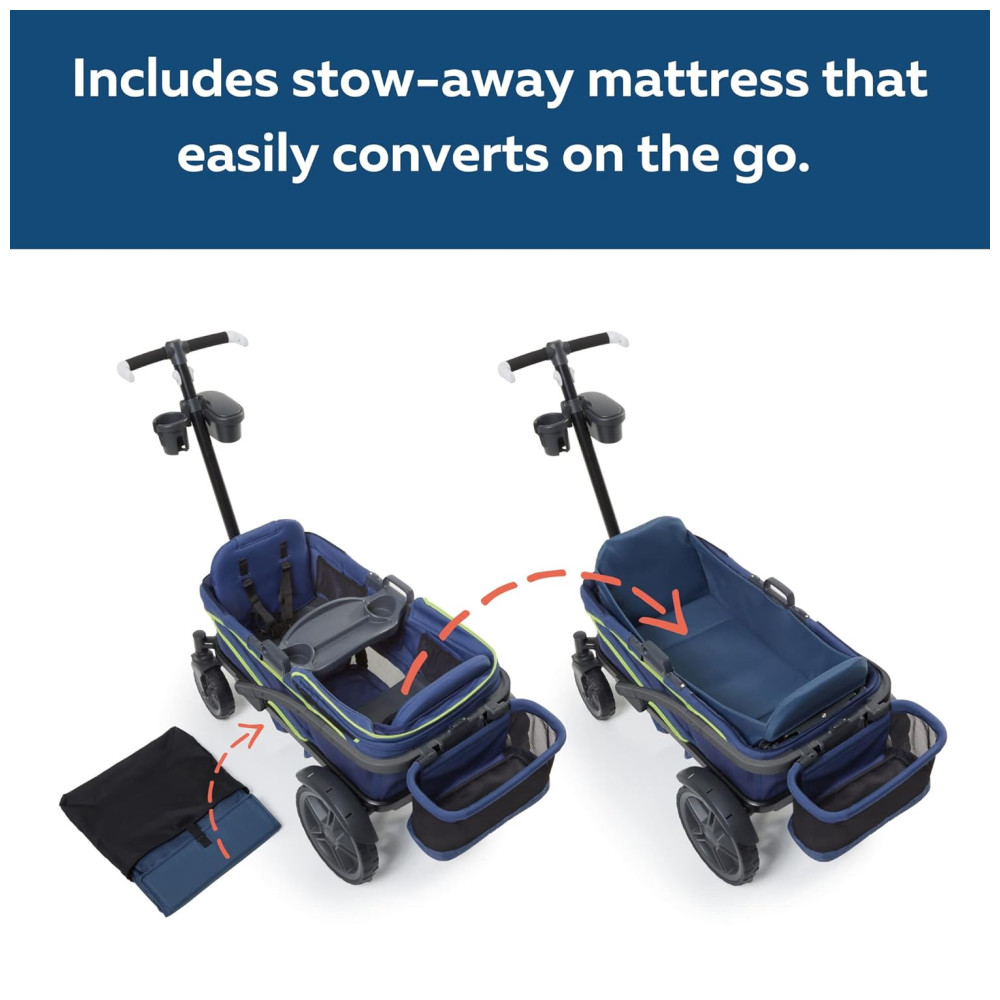 Há toneladas de armazenamento por dentro e por fora, incluindo bolsas internas de malha, bandeja de lanche com porta-copos, pai porta-copos e cesto de armazenamento removível. O vagão infantil também conta com colchão stowaway nap com bolsa de transporte, para que bebês e crianças pequenas possam se aconchegar e dormir confortavelmente. É importante mencionar que o adaptador de carro é vendido separadamente, permitindo que os pais combinem esses vagões de carrinho Gladly Family para crianças com a maioria dos assentos de carro infantis.