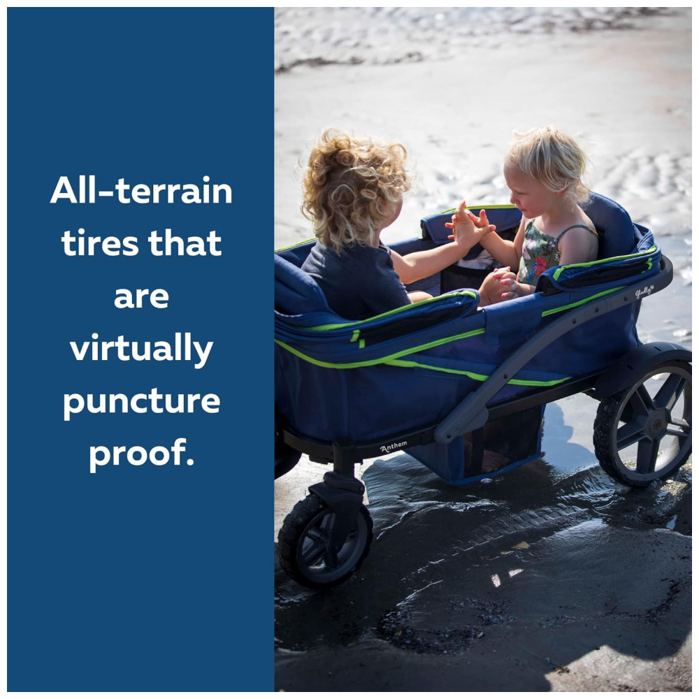 Este carrinho de bebê duplo é extremamente versátil e pode ser empurrado ou puxado. A estrutura é feita de alumínio resistente, garantindo segurança no dobramento e desdobramento para armazenamento e viagem. O vagão infantil está preparado para enfrentar sol, vento e chuva, com assentos e capota com malha respirável para manter as crianças frescas e secas. As rodas all-terrain robustas e a suspensão significam que este carrinho de bebê suave está pronto para qualquer coisa. Além disso, possui freio onetouch confiável e fácil de usar.