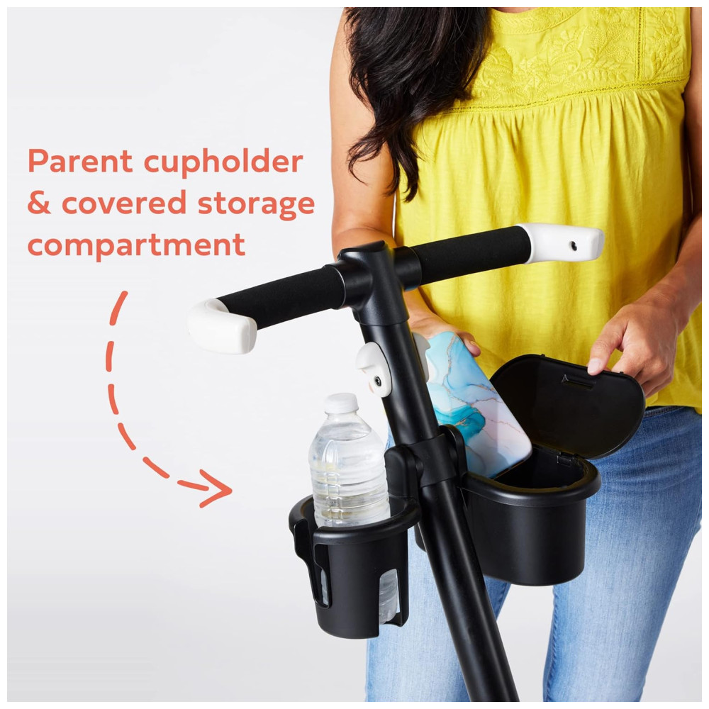 As coberturas XL removíveis e dobráveis, com inserções de malha respirável que fecham, oferecem ainda mais proteção e conforto para o bebê. O carrinho conta com toneladas de opções de armazenamento, incluindo bolsos internos de malha e um cesto de armazenamento removível. Há também um porta-copos para os pais, bandeja dupla para lanches e porta-copos para crianças.