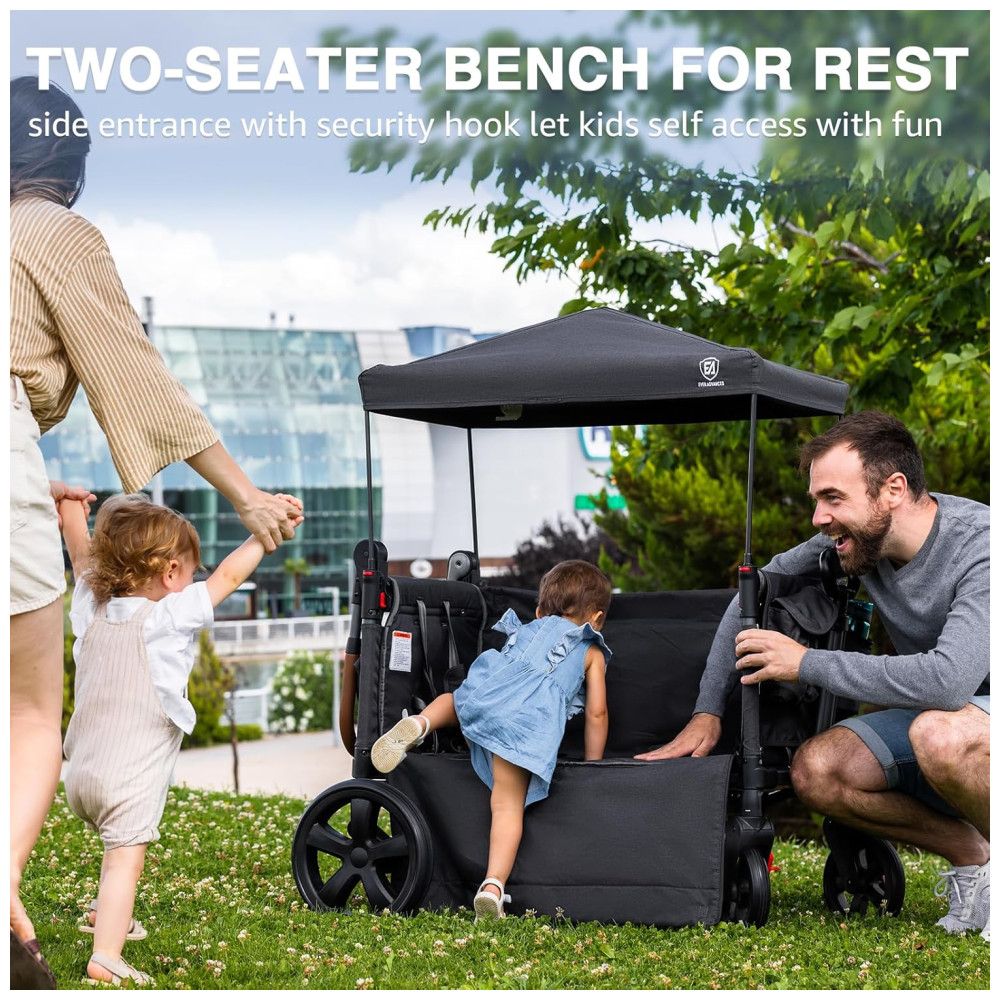 Os assentos acolchoados e os arneses ajustáveis em 3 posições garantem conforto excepcional aos pequenos passageiros. O amplo espaço de carga de 78 x 40 cm permite que as crianças se estiquem durante o passeio, proporcionando uma experiência mais agradável.