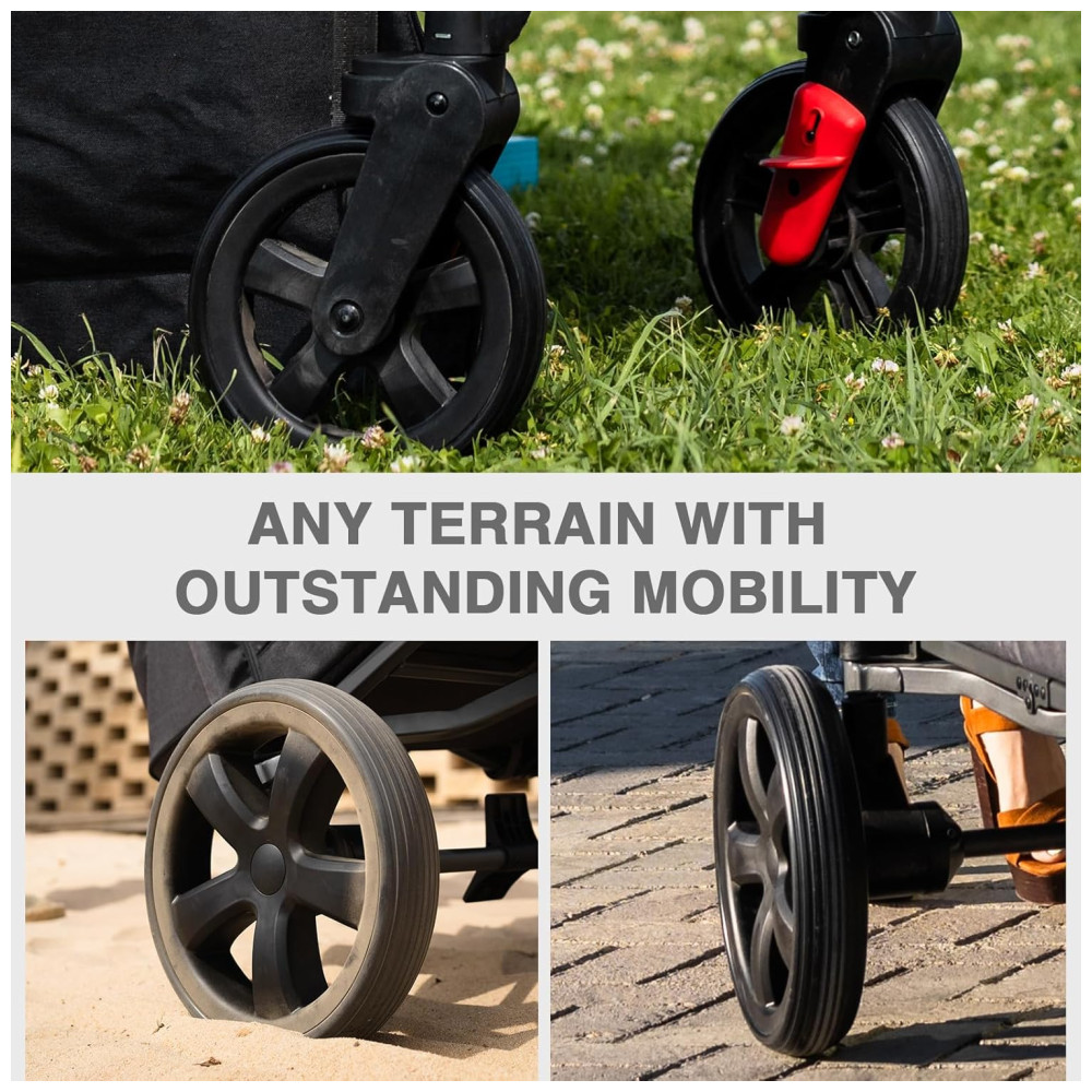 O carrinho é projetado com a segurança das crianças em mente, apresentando um cinto de segurança de 5 pontos integrado e dois assentos face a face, suportando até 49 kg (24 kg por assento). Os freios de pé em cada roda oferecem controle total de rotação de 360° e movimento linear, enquanto a capota UPF 50+ protege a pele sensível dos raios nocivos do sol.
