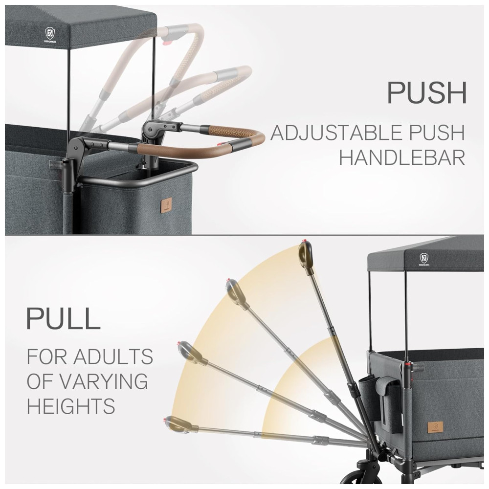 Com um guiador de empurrar ajustável, projetado para pais de alturas variadas, e uma alça telescópica adaptável a terrenos acidentados ao ar livre, o carrinho é fácil de manusear em qualquer situação.