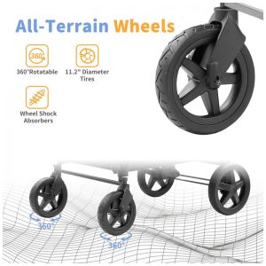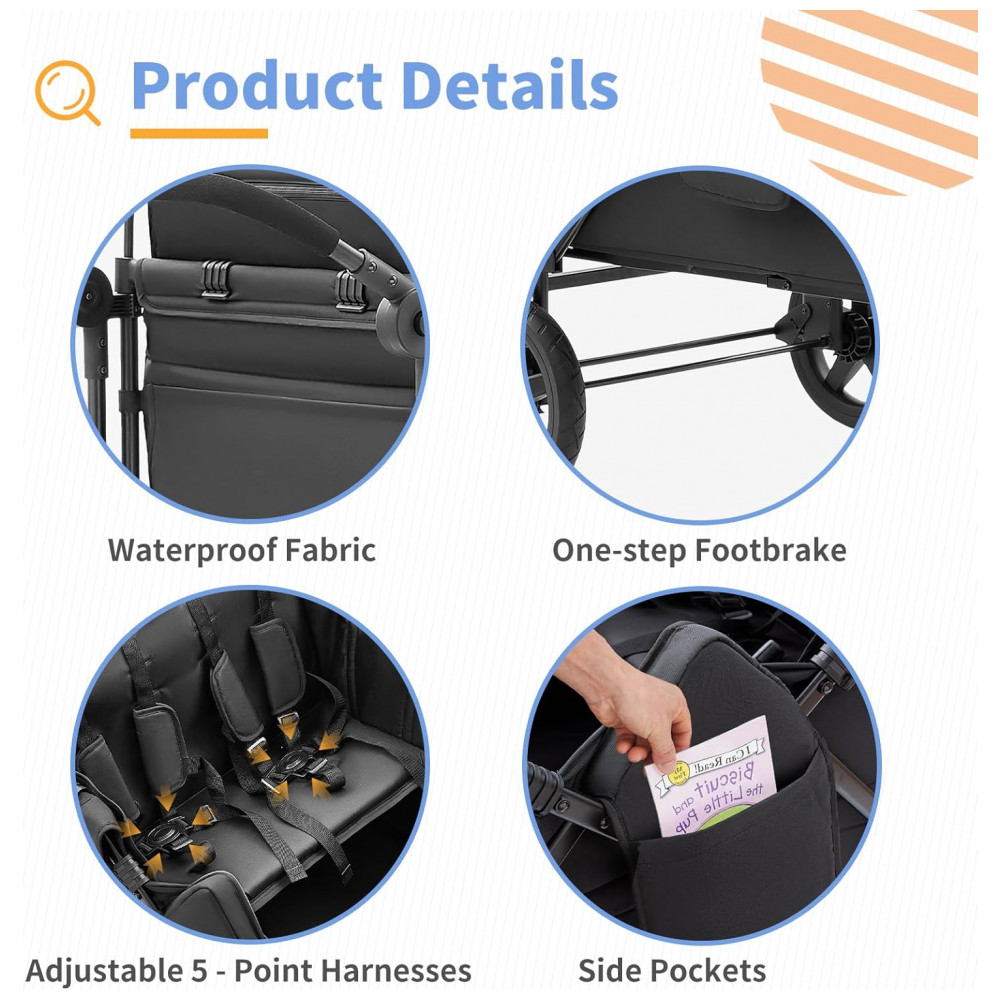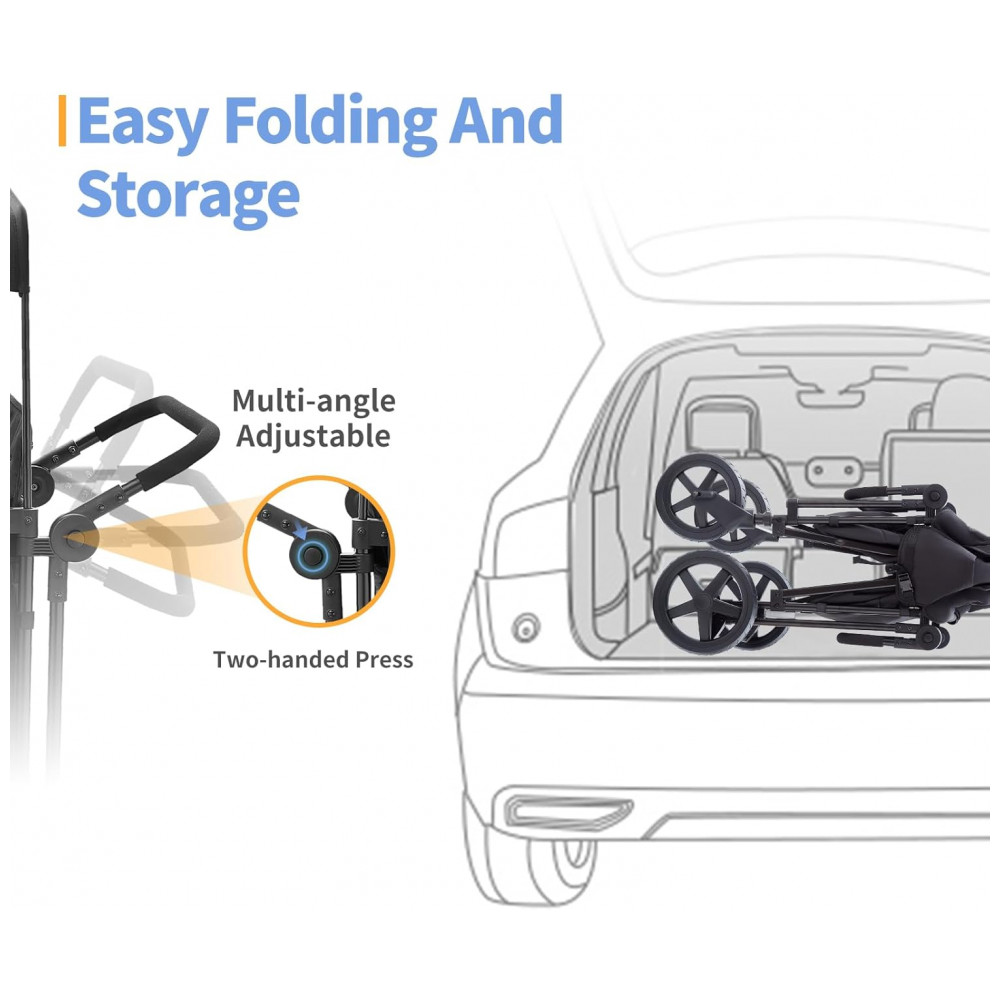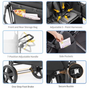 O carrinho possui uma barra de empurrar dupla ajustável em 10 seções, um sistema de freio de segurança com modo de freio de pé único e uma roda traseira de 27 cm com movimento giratório de 360 graus. É dobrável e fácil de transportar, com um tamanho dobrado de 45 x 66 x 93 cm. É aplicável a uma variedade de lugares, como praia, parque, camping e viagens, sendo fabricado em tecido Oxford resistente à sujeira e fácil de limpar. O carrinho é projetado para crianças maiores de 12 meses e suporta um peso máximo de 136,05 quilos.
