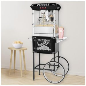 A máquina é fácil de usar, com zonas de alimentos em aço inoxidável e vidro temperado. Ela possui três interruptores independentes para o agitador de chaleira, o aquecedor de luz e o aquecedor de panelas. Com materiais de metal, aço inoxidável e vidro temperado, suas dimensões são de 73,66 cm x 53,34 cm x 156,84 cm e tem potência de 860 watts. A cor é preta e seu design nostálgico captura o charme vintage das máquinas antigas, adicionando um toque retrô de decoração de cinema a qualquer ambiente.