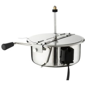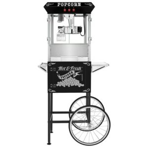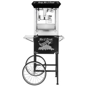A máquina de pipoca quente e fresca com carrinho da Superior Popcorn Company é perfeita para quem quer levar a experiência do cinema para casa. Com uma chaleira de aço inoxidável de 0,28 gramas, ela produz cerca de 11,37 litros de pipoca em minutos. Além disso, possui uma plataforma de aquecimento para manter o lanche fresco e uma gaveta de solteirona para coletar os grãos rejeitados, o que facilita a limpeza.