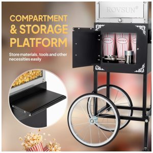 RODAS PARA MOBILIDADE A máquina de pipoca vem com um carrinho com 2 rodas para facilitar a mobilidade. Além disso, o carrinho foi projetado com um compartimento de zenamento para zenar acessórios e outros itens pequenos necessários para fazer pipoca