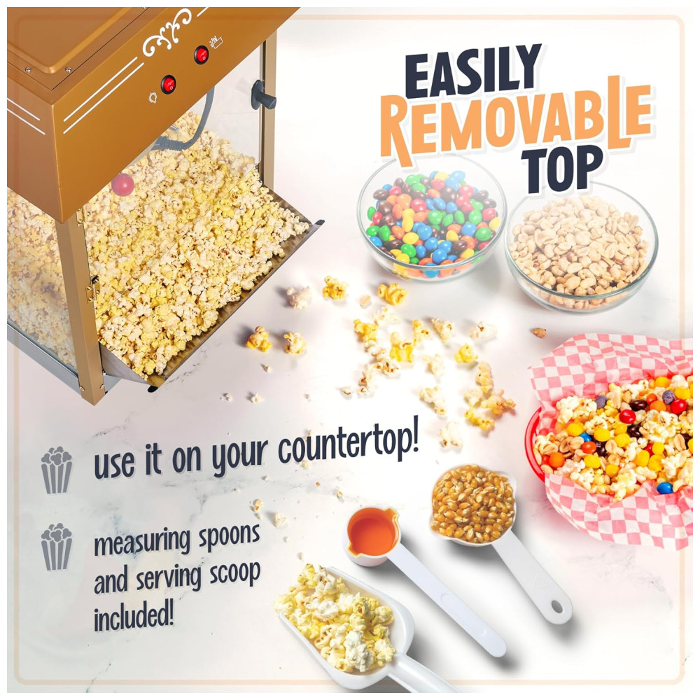 Transforme sua casa em um verdadeiro cinema com o carrinho profissional de pipoca Nostalgia. Com um visual vintage que remete aos cinemas mudos e carnavais dos anos 1900, este carrinho possui uma grande panela de aço inoxidável de 295 ml de capacidade com sistema integrado de agitação de grãos, permitindo a produção de até 40 xícaras de pipoca de cinema por lote. Além disso, o carrinho conta com prateleira de utilidades, iluminção, bandeja coletora de grãos e compartimento de armazenamento para todos os seus acessórios. Suas rodas de borracha estilo bicicleta e alça facilitam a mobilidade, sendo possível removê lo da base para uso no balcão. E para completar, as janelas de vidro de segurança temperado resistem a quebras, arranhões e calor, garantindo a segurança de toda a família.