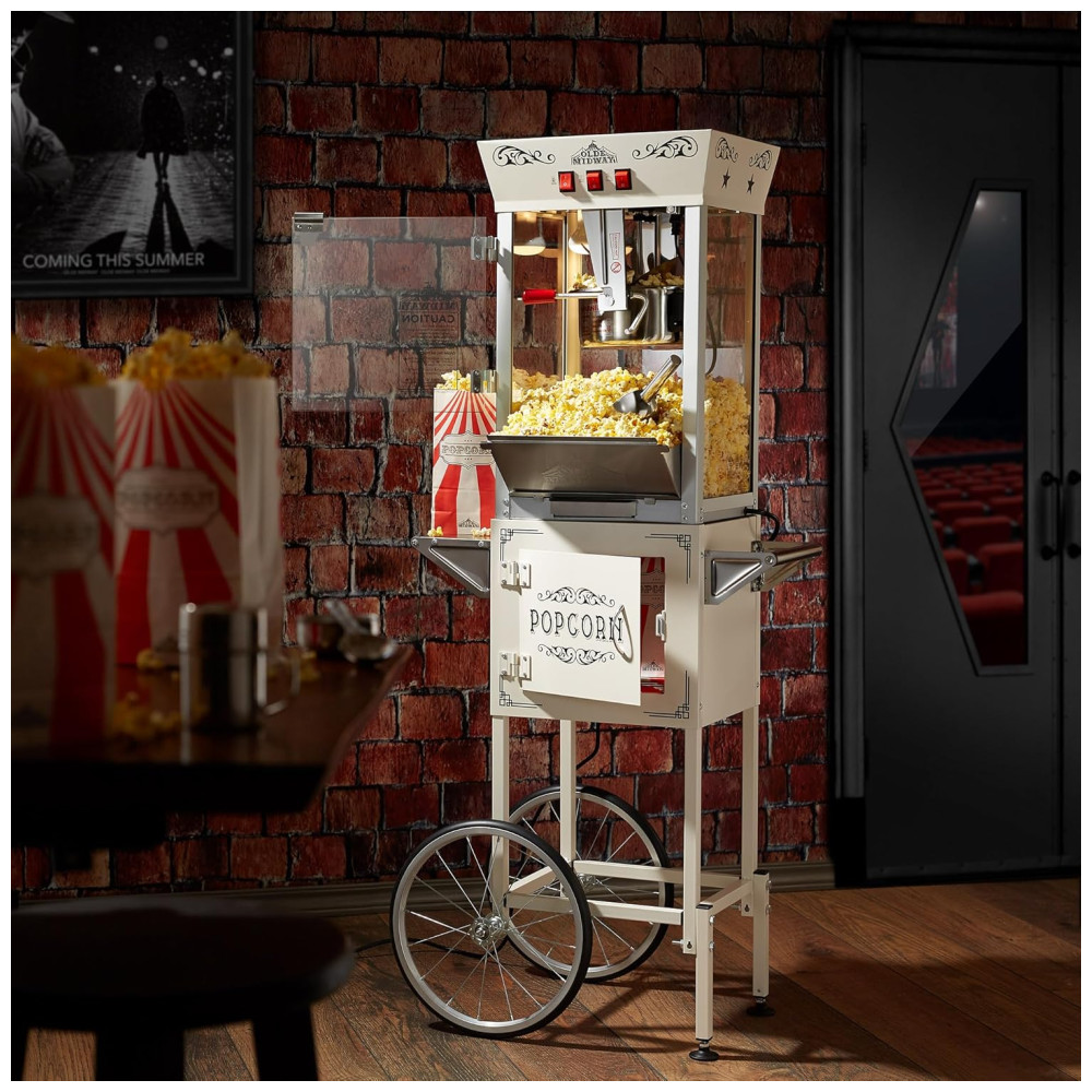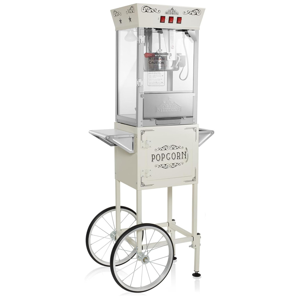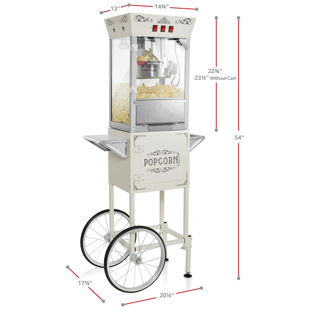 A máquina de pipoca com carrinho Olde Midways apresenta um design vintage com recursos modernos, sendo ideal para uso em home theaters, empresas, eventos escolares, festas e muito mais. O carrinho possui 16 rodas estilo bicicleta e um armário para suprimentos de pipoca. A grande chaleira de aço inoxidável de 0,28 gramas rende cerca de 10,8 kg de pipoca por lote.