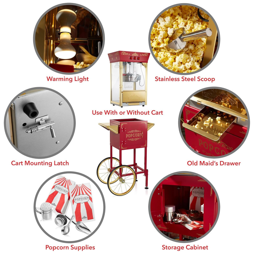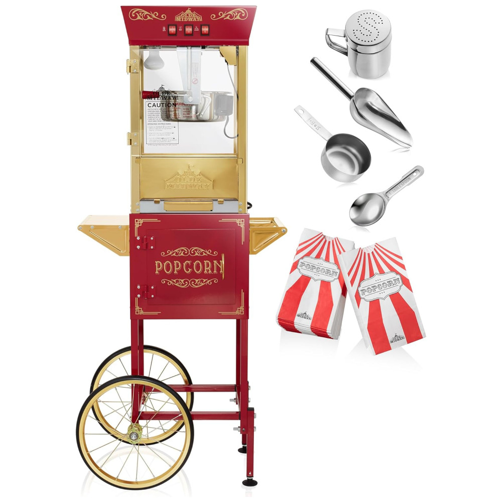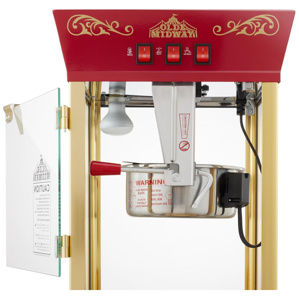 Faça pipoca gourmet estilo cinema em qualquer lugar com a Máquina de Pipoca Olde Midways com Carrinho. Com um design vintage e recursos modernos, esta máquina de pipoca de 850 watts tem uma chaleira de 0,28 gramas que pode produzir cerca de 10,8 kg de pipoca por lote. Ideal para cinemas domésticos, salas de descanso de escritórios, noites de jogos, carnavais escolares e muito mais.