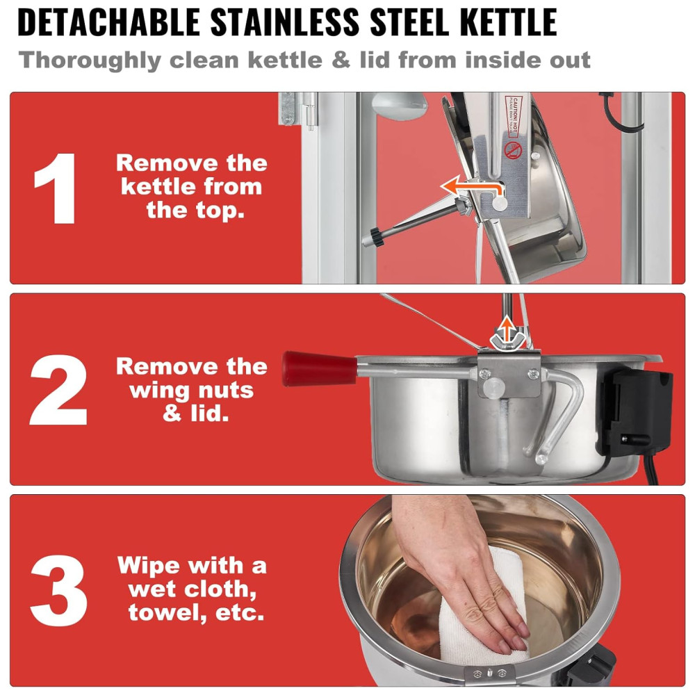 Esta máquina de pipoca comercial é perfeita para atender à demanda em sua barraca de concessão, estourando até 48 xícaras de pipoca por lote com sua chaleira de 0,28 gramas e 850 W de potência. O pré aquecimento da chaleira leva apenas alguns minutos e a pipoca pronta cairá na plataforma de aquecimento, mantendo se fresca até que você esteja pronto para servir. A operação é simplificada por meio de 3 interruptores que controlam o aquecedor, agitador e aquecedor de panelas. A estrutura durável é feita de aço laminado a frio e painéis de vidro temperado, com portas com trava magnética para acesso rápido. A limpeza é fácil graças às porcas borboleta da chaleira e à bandeja de migalhas removível. A máquina vem com acessórios de qualidade alimentar, incluindo uma colher de pipoca e duas colheres para medir milho e óleo. Com rodas de 35 cm e alça de empurrar, você pode transportar sua máquina de pipoca para qualquer lugar.