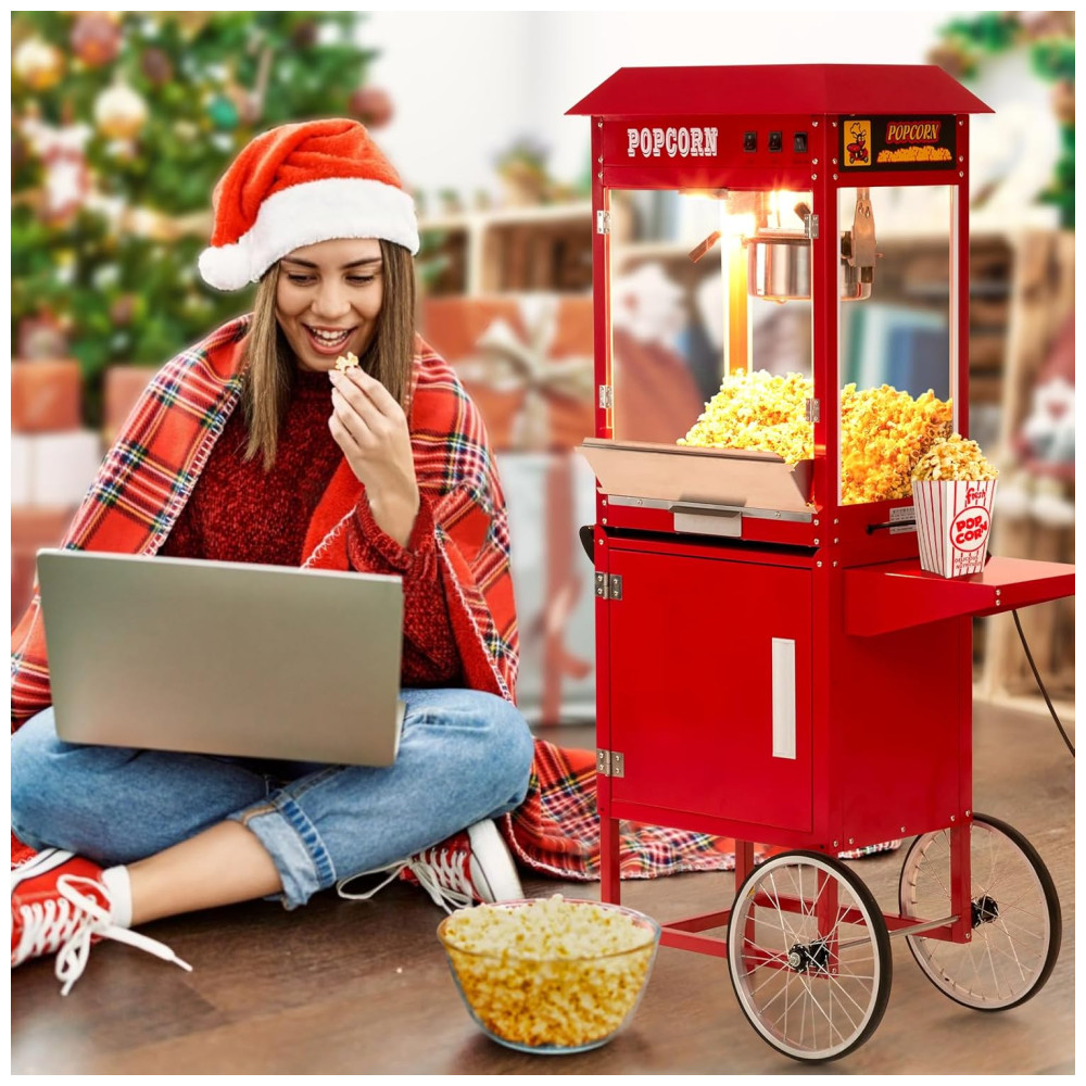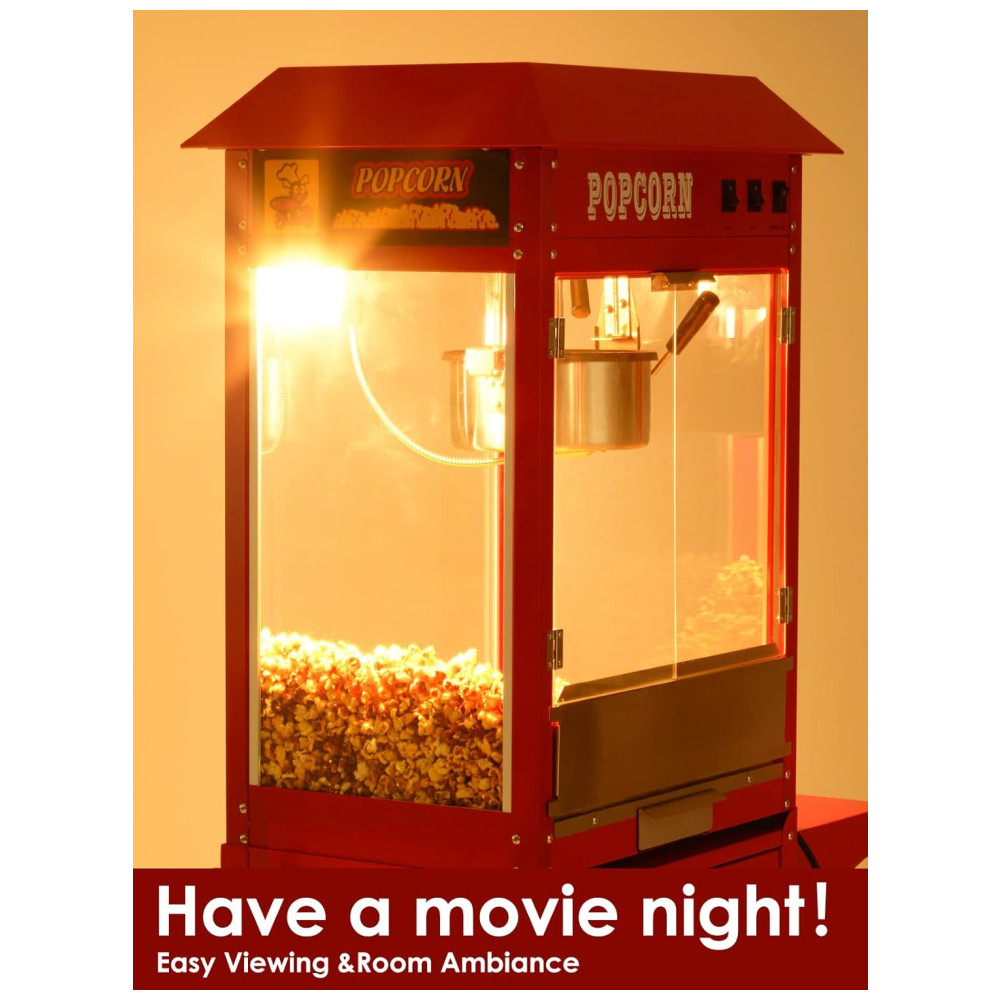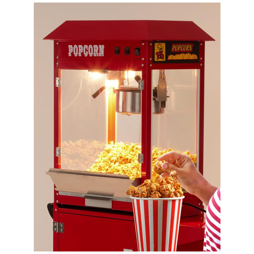 Desfrute de pipocas deliciosas em apenas 3 minutos com a máquina de pipoca comercial equipada com um poderoso elemento de aquecimento de 850 W. Com capacidade para produzir até 60 xícaras de pipoca por lote, a máquina é ideal para atender grandes demandas em eventos como carnavais, parques de diversões e reuniões. O armário disponível permite que você mantenha seus materiais organizados e acessíveis. Feita com vidro temperado de alta qualidade e materiais resistentes, a máquina é durável e pode suportar o uso frequente. Com três interruptores de controle simplificado Quente, Mexer e Calor de panela , qualquer membro da equipe pode operá la facilmente. A plataforma de aquecimento com tubo de aquecimento de 60 W mantém a pipoca estourada quente e fresca até que você esteja pronta para servir. A máquina também ilumina a pipoca, tornando a ainda mais atraente e irresistível. Com uma tampa articulada abaixo da plataforma de aquecimento e bandeja removível para migalhas, a limpeza é fácil e conveniente. A máquina foi projetada pensando no seu conforto e conveniência.