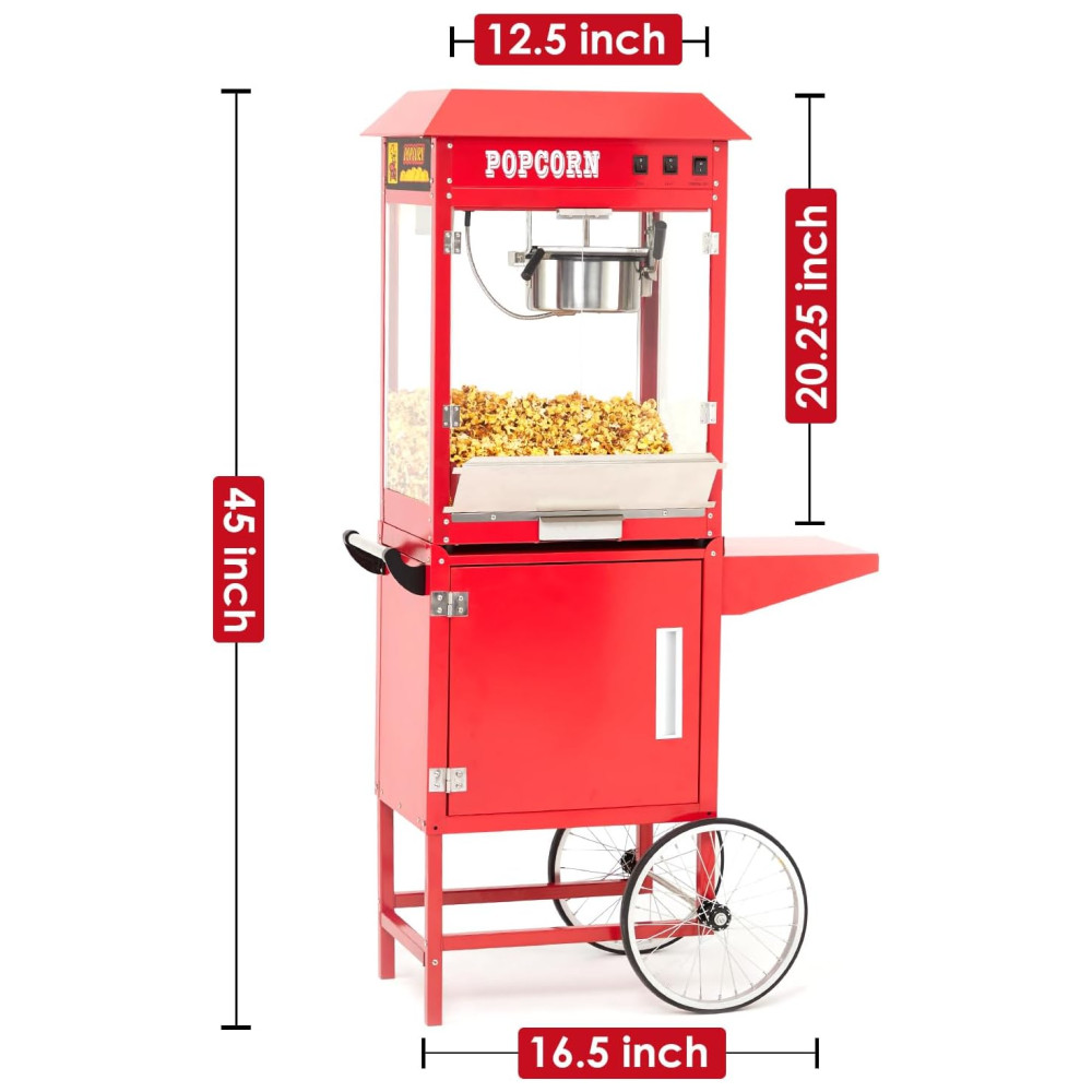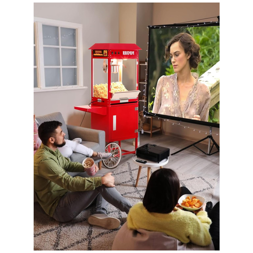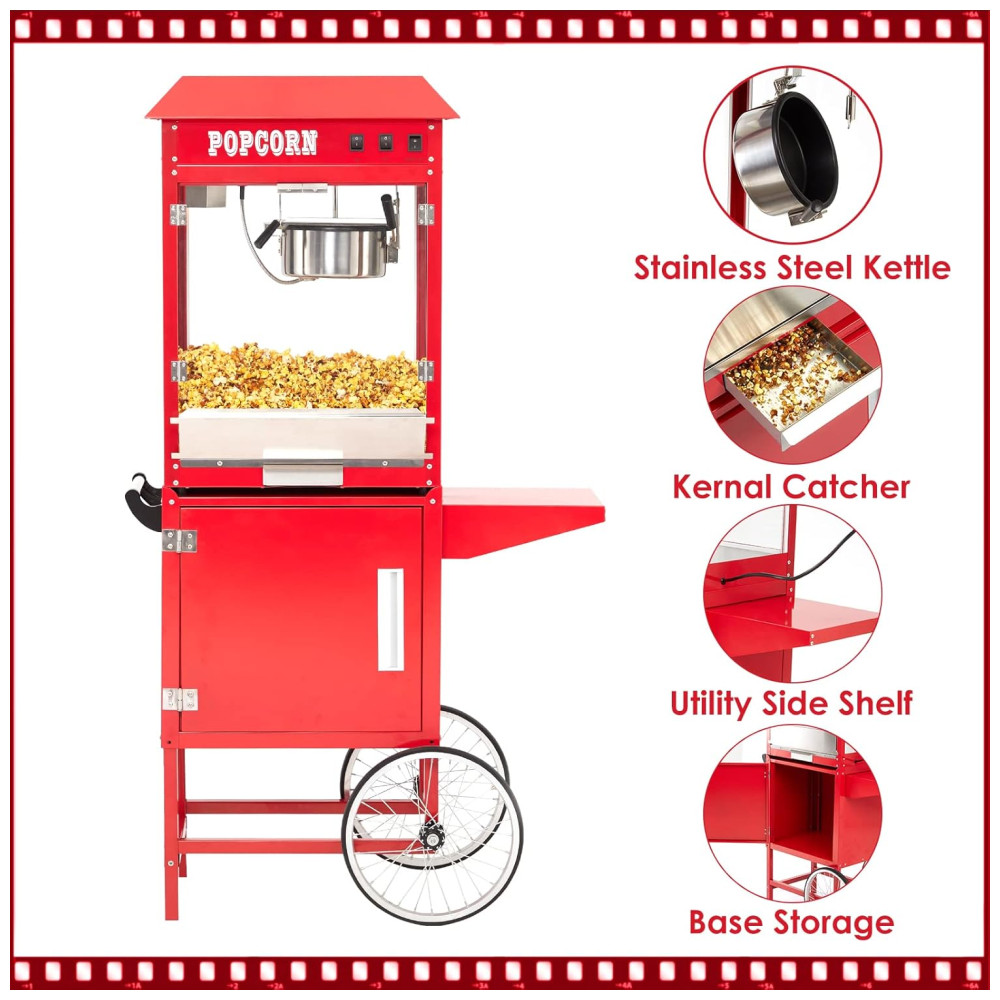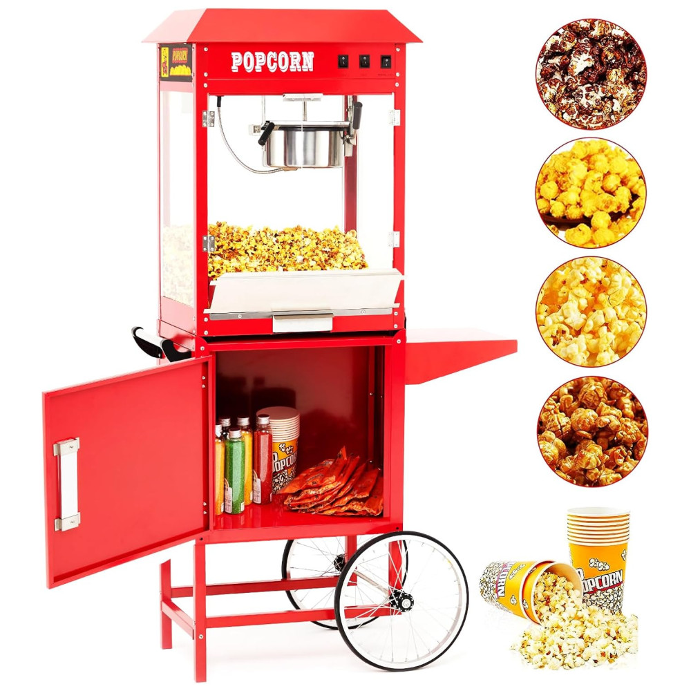 Desfrute de pipocas deliciosas em apenas 3 minutos com a máquina de pipoca comercial equipada com um poderoso elemento de aquecimento de 850 W. Com capacidade para produzir até 60 xícaras de pipoca por lote, a máquina é ideal para atender grandes demandas em eventos como carnavais, parques de diversões e reuniões. O armário disponível permite que você mantenha seus materiais organizados e acessíveis. Feita com vidro temperado de alta qualidade e materiais resistentes, a máquina é durável e pode suportar o uso frequente. Com três interruptores de controle simplificado Quente, Mexer e Calor de panela , qualquer membro da equipe pode operá la facilmente. A plataforma de aquecimento com tubo de aquecimento de 60 W mantém a pipoca estourada quente e fresca até que você esteja pronta para servir. A máquina também ilumina a pipoca, tornando a ainda mais atraente e irresistível. Com uma tampa articulada abaixo da plataforma de aquecimento e bandeja removível para migalhas, a limpeza é fácil e conveniente. A máquina foi projetada pensando no seu conforto e conveniência.