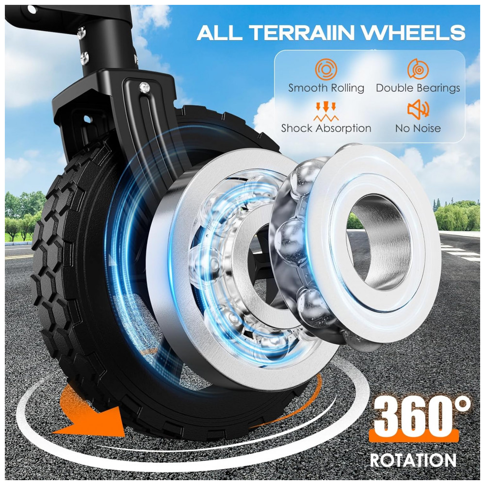 Projeto de rolamento duplo construído em rolamentos duplos para garantir uma capacidade máxima de carga, que pode rolar suavemente e com menos esforço e ter uma capacidade de manobra forte o suficiente para manter suas rias intactas sobre lama, grama, solavancos e meio fio. Ao mesmo tempo, adaptamos o design do rolamento duplo para prolongar a vida útil e o desempenho da roda.
