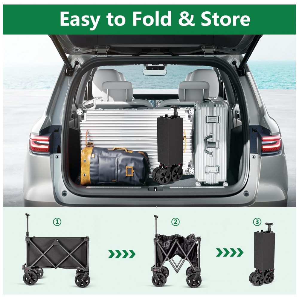 FÁCIL TRANSPORTE Configura em segundos, sem necessidade de montagem Dobrável na bolsa de transporte para zenamento conveniente. Pequeno o suficiente para caber no armário, na parede ou no porta malas de qualquer carro padrão. O carrinho dobrável de utilitário de praia é perfeito para transportar compras, em passeios em família ou como um carrinho de rias, e ótimo para viagens, viagens, férias, jardim, parque, camping, mercearia, zoológico, eventos esportivos ao ar livre ou apenas mover coisas.