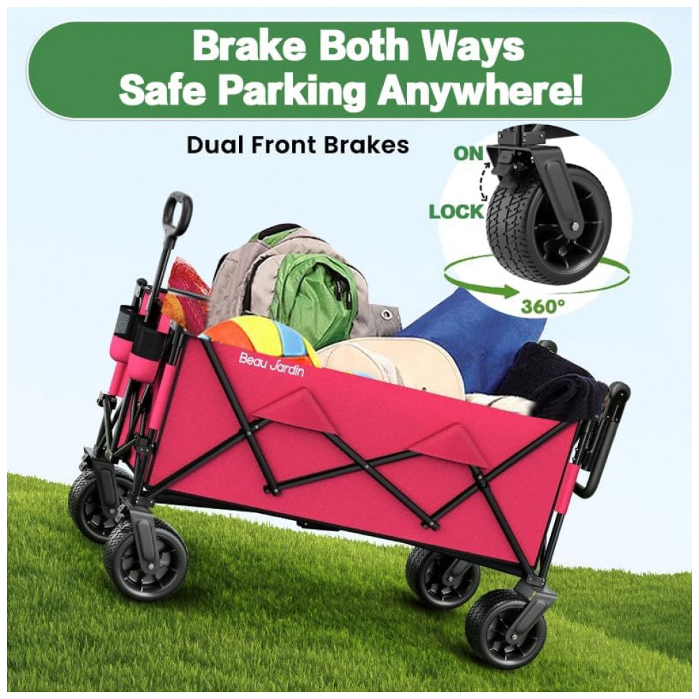 Rodas grandes o vagão de praia dobrável vem com rodas maciças grossas de 10x de espessura. Este vagão dobrável tem alça telescópica ajustável para transporte sem esforço e fornece um controle fácil na maioria dos terrenos. Muito compacto quando dobrado para alça de mão para fácil transporte.