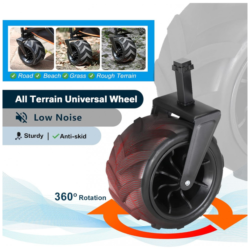 Carroça Rodas Todo Terreno Este carrinho com rodas pesadas tem rodas maciças de 10x, não apenas para a areia da praia, mas para manobras na neve, terra, rua ou grama. Ele também torna o carrinho de mão robusto para navegar rapidamente em meio fios ou pedras, enquanto você puxa cargas pesadas no terreno acidentado e ao ar livre.