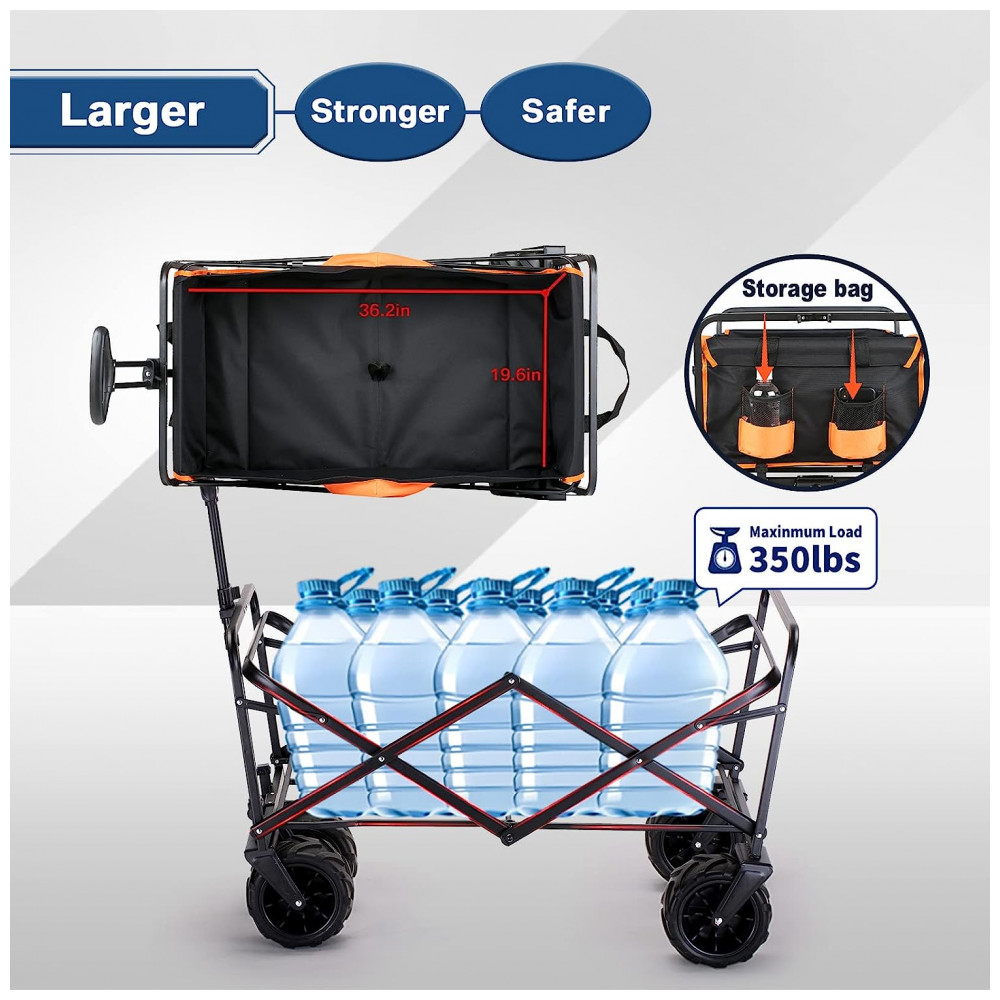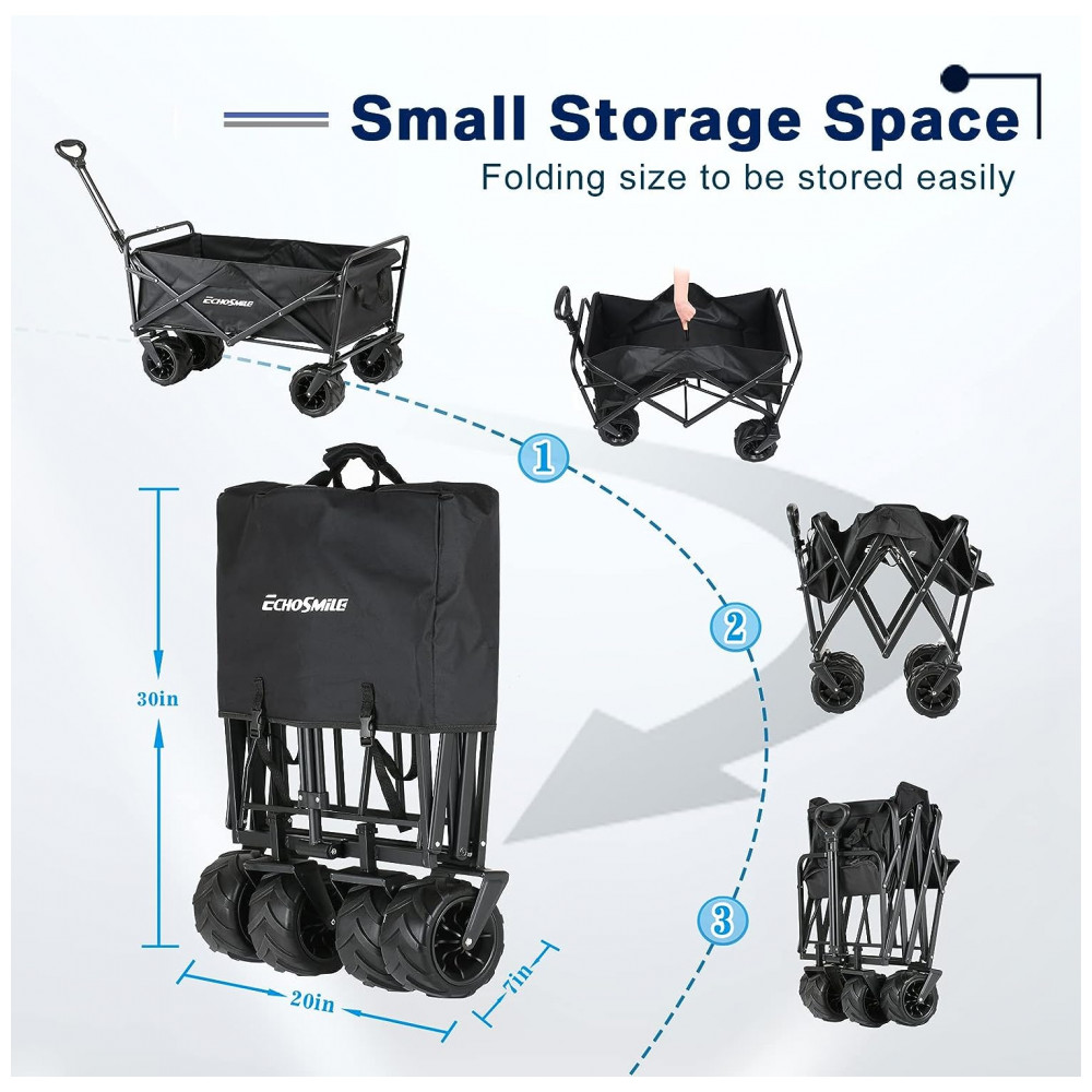 Montagem e dobra rápida Não é necessária montagem para serviço pesado de vagão dobrável grande EchoSmile. Um tamanho conveniente para zenamento e uso expandido. Rápido e fácil de configurar em segundos e possui uma alça acoplada para mover o carrinho de praia. Este vagão dobrável para serviço pesado pode ser dobrado de forma compacta para ser zenado facilmente em um carro compacto ou garagem, garantindo fácil transporte.