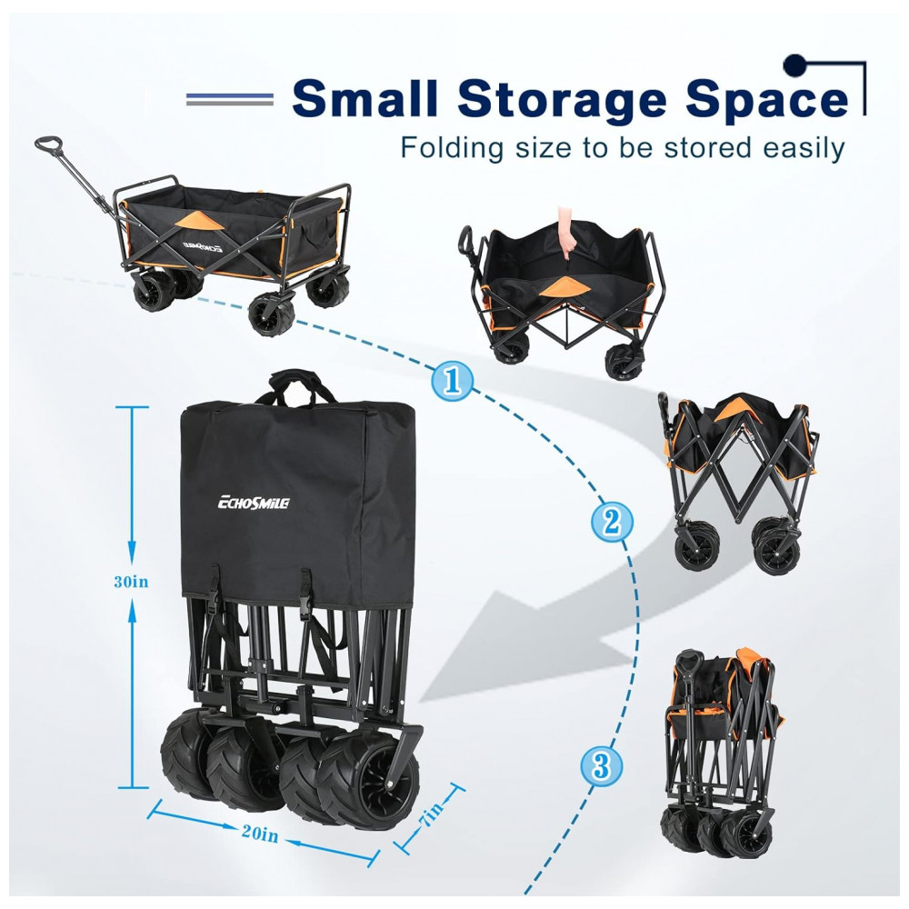 Montagem e dobra rápida Não é necessária montagem para serviço pesado de vagão dobrável grande EchoSmile. Um tamanho conveniente para zenamento e uso expandido. Rápido e fácil de configurar em segundos e possui uma alça acoplada para mover o carrinho de praia. Este vagão dobrável para serviço pesado pode ser dobrado de forma compacta para ser zenado facilmente em um carro compacto ou garagem, garantindo fácil transporte.