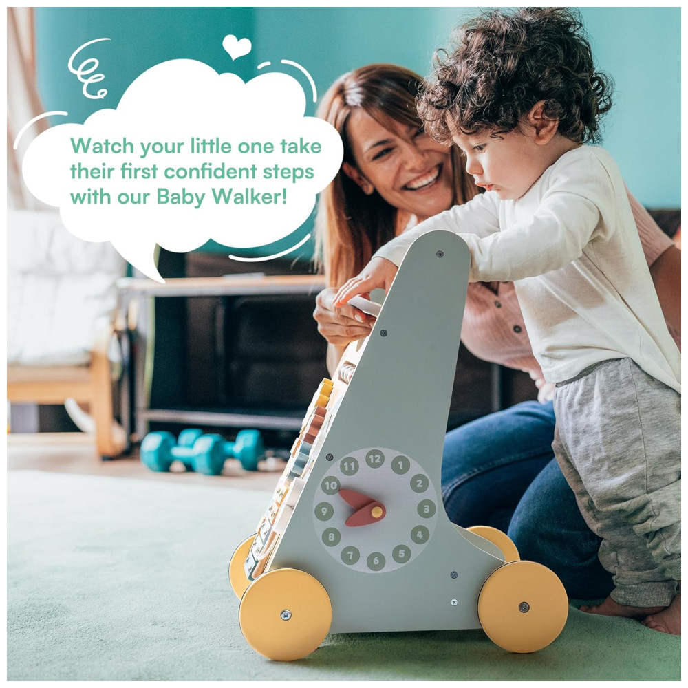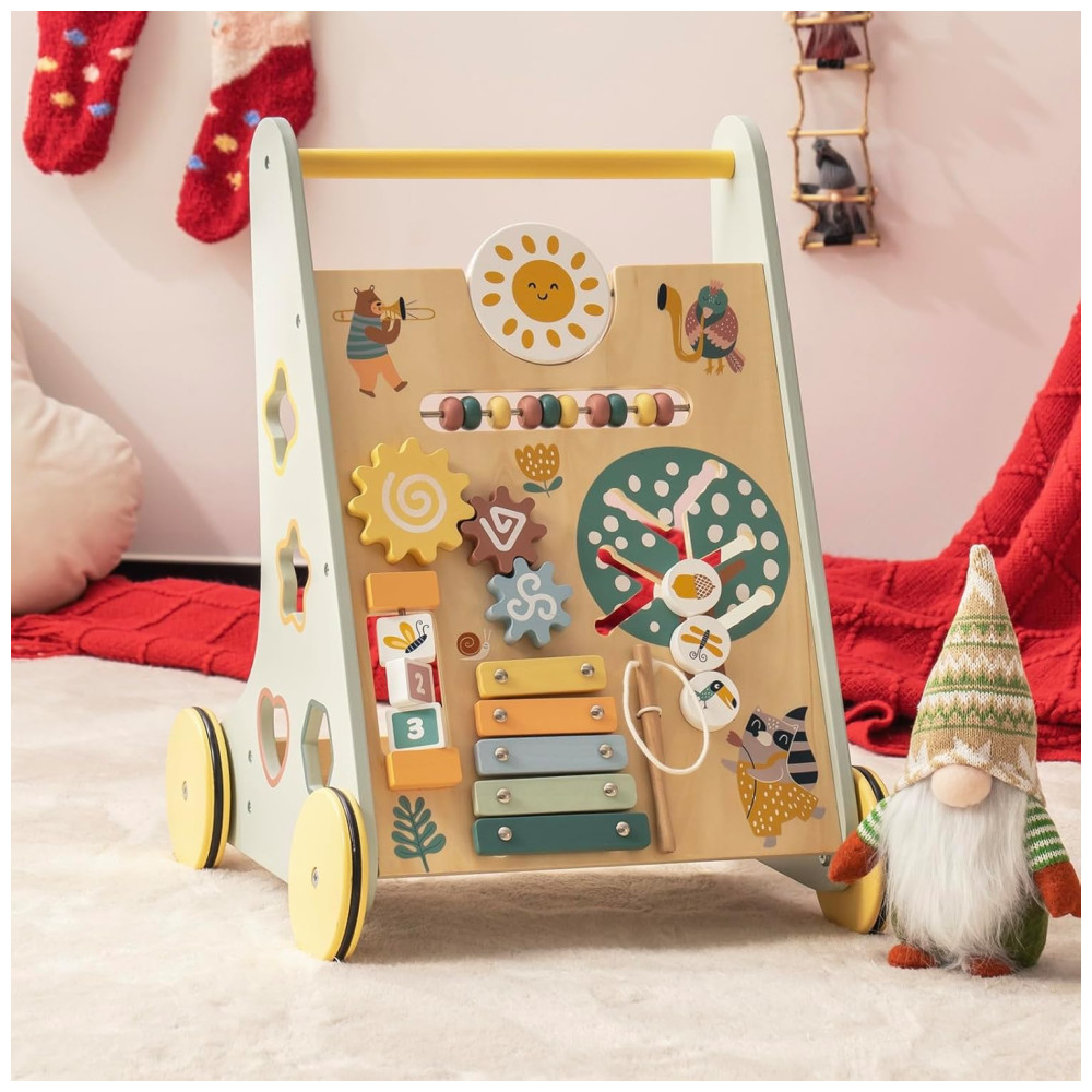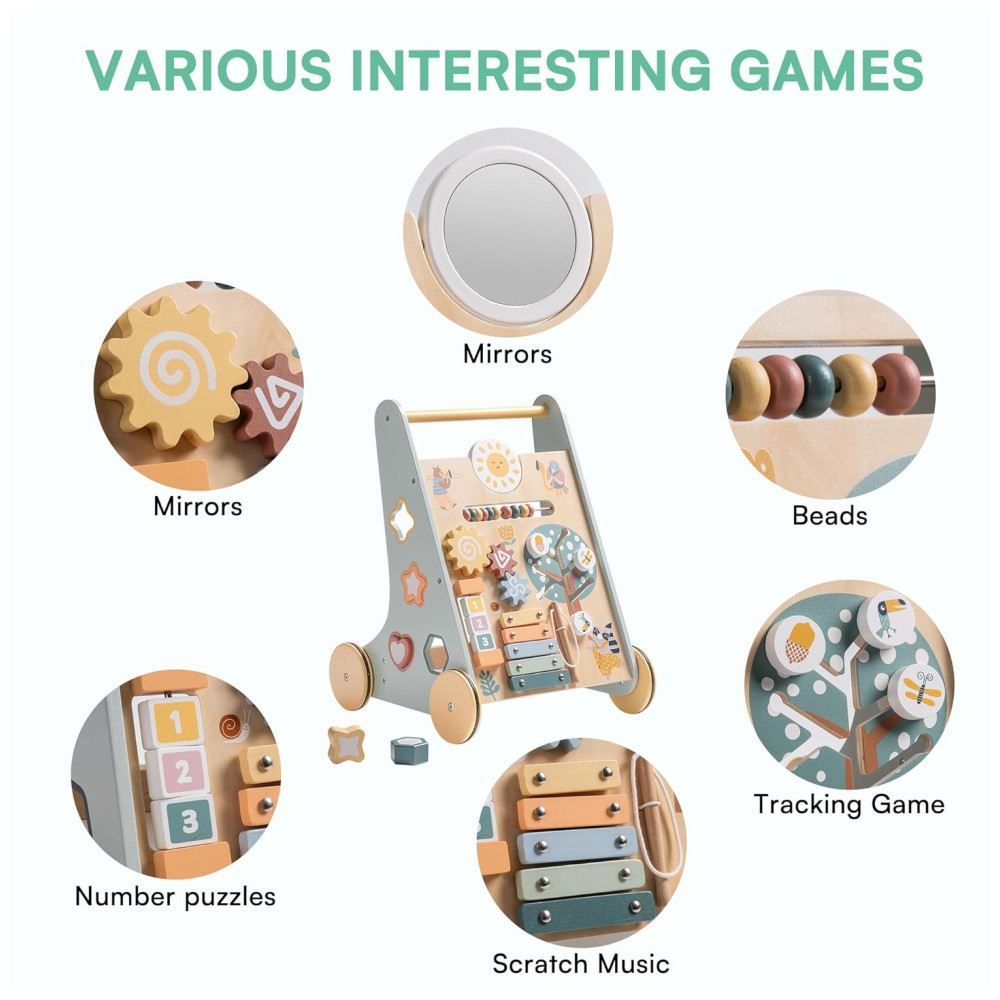 Carrinho Educativo de Empurrar de Madeira ROBUD com Centro de Atividades e Armazenamento – Brinquedo Montessori para Crianças Aprendendo a Andar