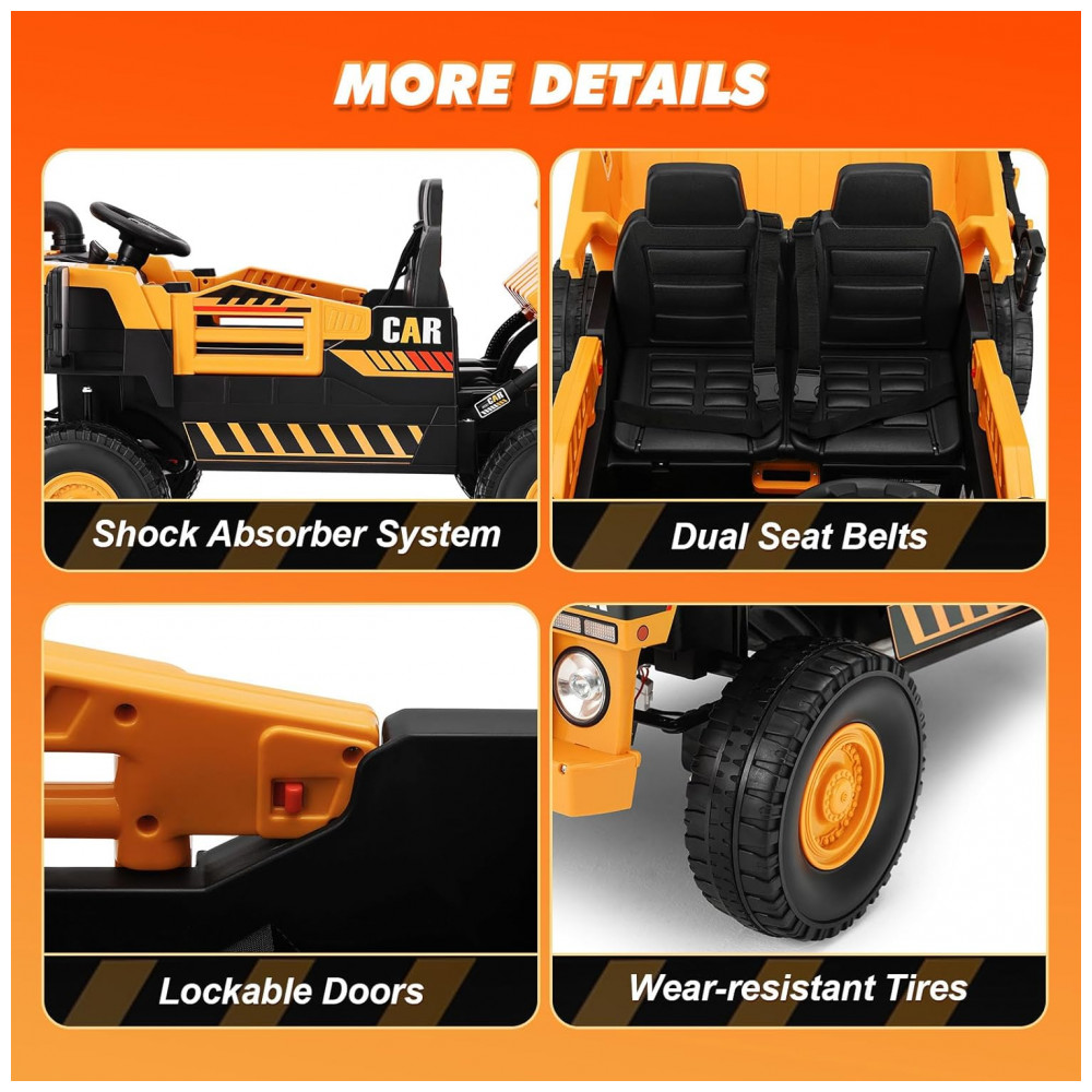 Possui caçamba basculante elétrica funcional para simulação de carga, compartimento para acessórios e pá-brinquedo, painel Bluetooth integrado com reprodução de músicas, interface USB e comando de áudio via botões no volante. Controle remoto parental de 2,4GHz com três velocidades e ajuste de direção (frente/reverso) permite supervisão total do deslocamento. Os dois assentos de 20 polegadas contam com cintos de segurança de três pontos e travas em portas laterais. Iluminação LED frontal, buzina, histórias/músicas temáticas e estrutura principal em polipropileno + metal garantem durabilidade e aprovação ASTM F963-23.