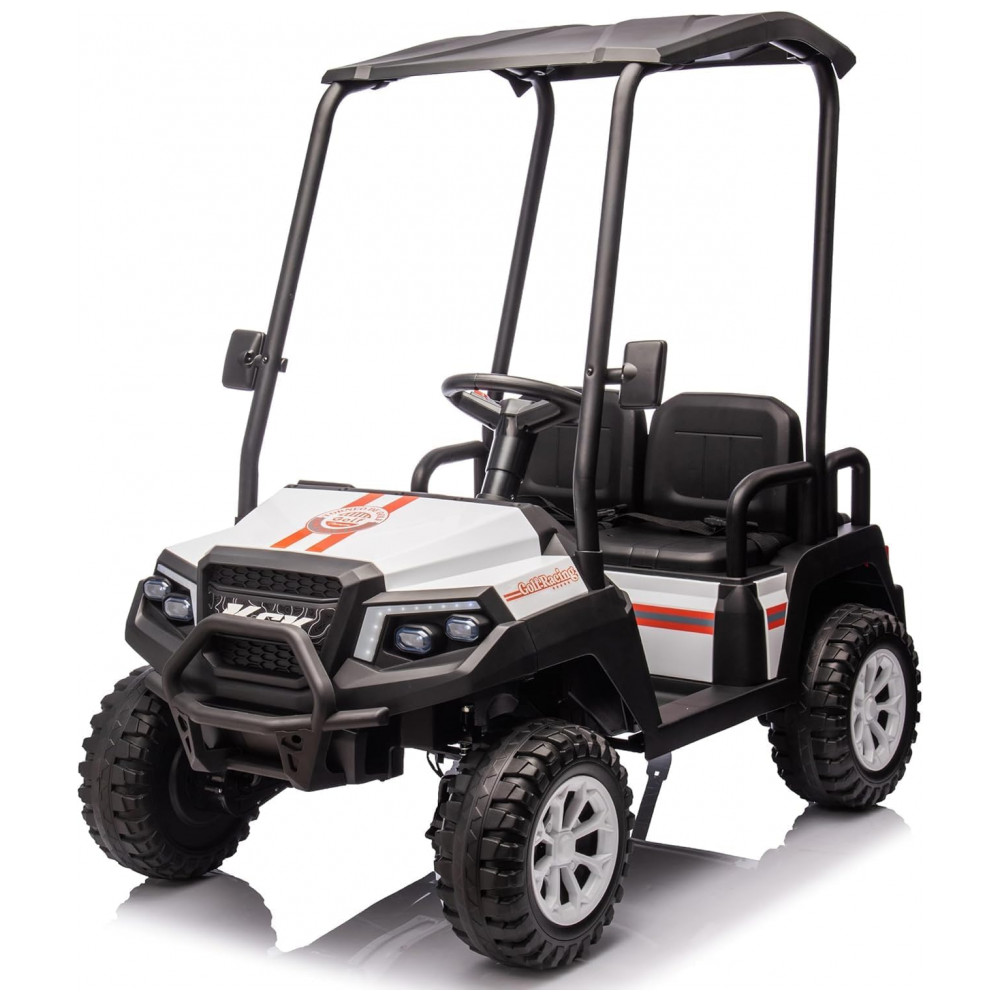 O carrinho elétrico infantil Sopbost Golf Cart 24V é projetado com tração 4×4 (quatro motores de 24V), permitindo uso por até 4 crianças graças ao seu layout “back-to-back” (dois assentos dianteiros e dois traseiros). A bateria de 24V 7Ah oferece autonomia média de 1 a 2 horas por ciclo para crianças de 3 a 8 anos, suportando até 100 kg. Os quatro pneus em EVA, com suspensão de molas e sistema anti-tombamento traseiro, garantem ótima absorção de impacto em pisos planos e irregulares (grama, lajota, terra). O teto em polipropileno proporciona proteção solar e visual temático de carrinho de golfe.