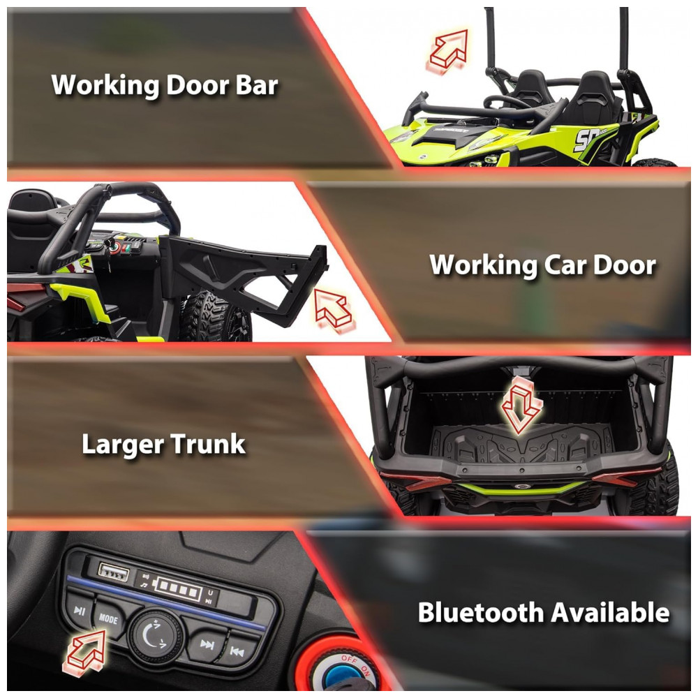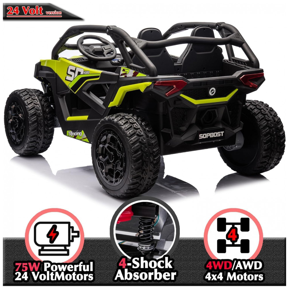 Carrinho Elétrico Infantil 4×4 Sopbost XL 24V 10Ah 2 Lugares 4 Motores 75W Controle Remoto Suspensão Molas Bluetooth Verde