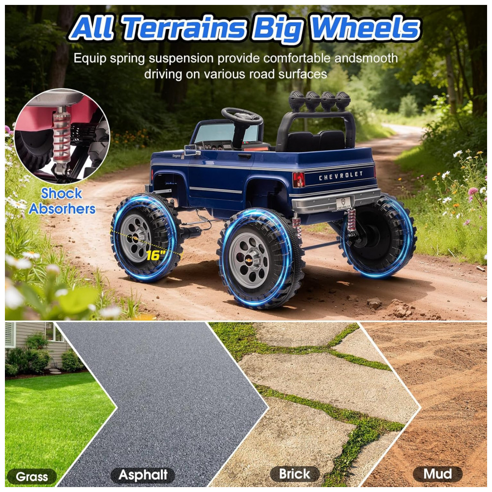 O carrinho elétrico licenciado Chevrolet Cheyenne 24V da MUKIDY é uma réplica fiel em escala real, apresentando design vintage com detalhes realistas como sons autênticos de motor e assento extra largo de 20 polegadas, ideal para acomodar duas crianças pequenas confortavelmente. Equipado com dois motores de 200W, oferece potência total de 400W para desempenho robusto em variados terrenos, possibilitando velocidades de até 5.9 mph com bateria recarregável de 24V que garante 1 a 2 horas de diversão contínua.