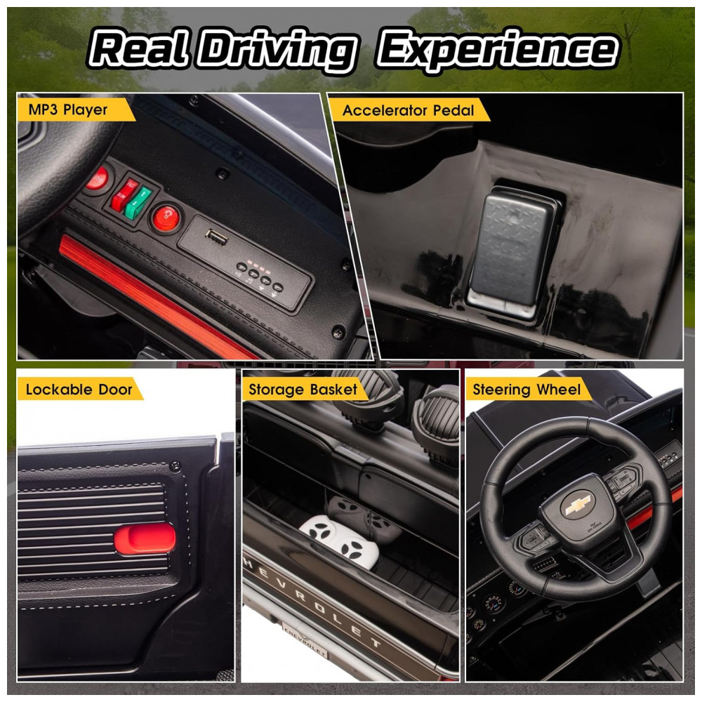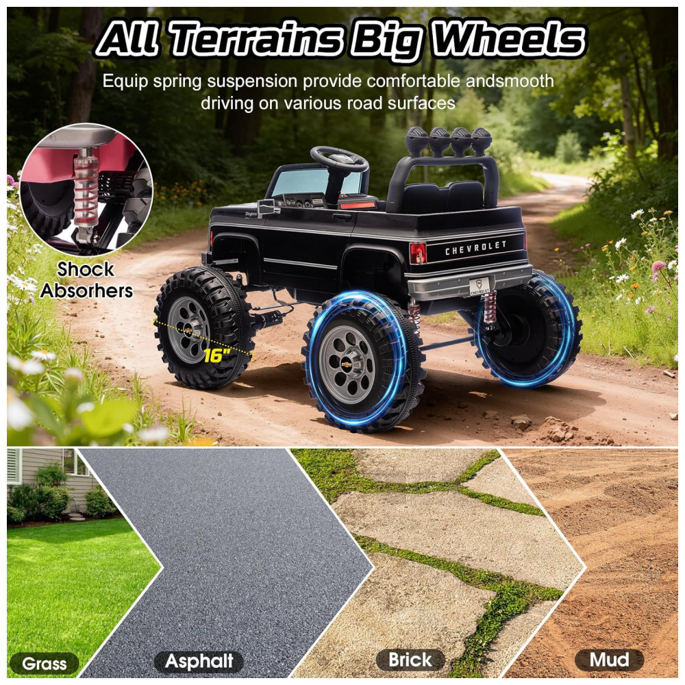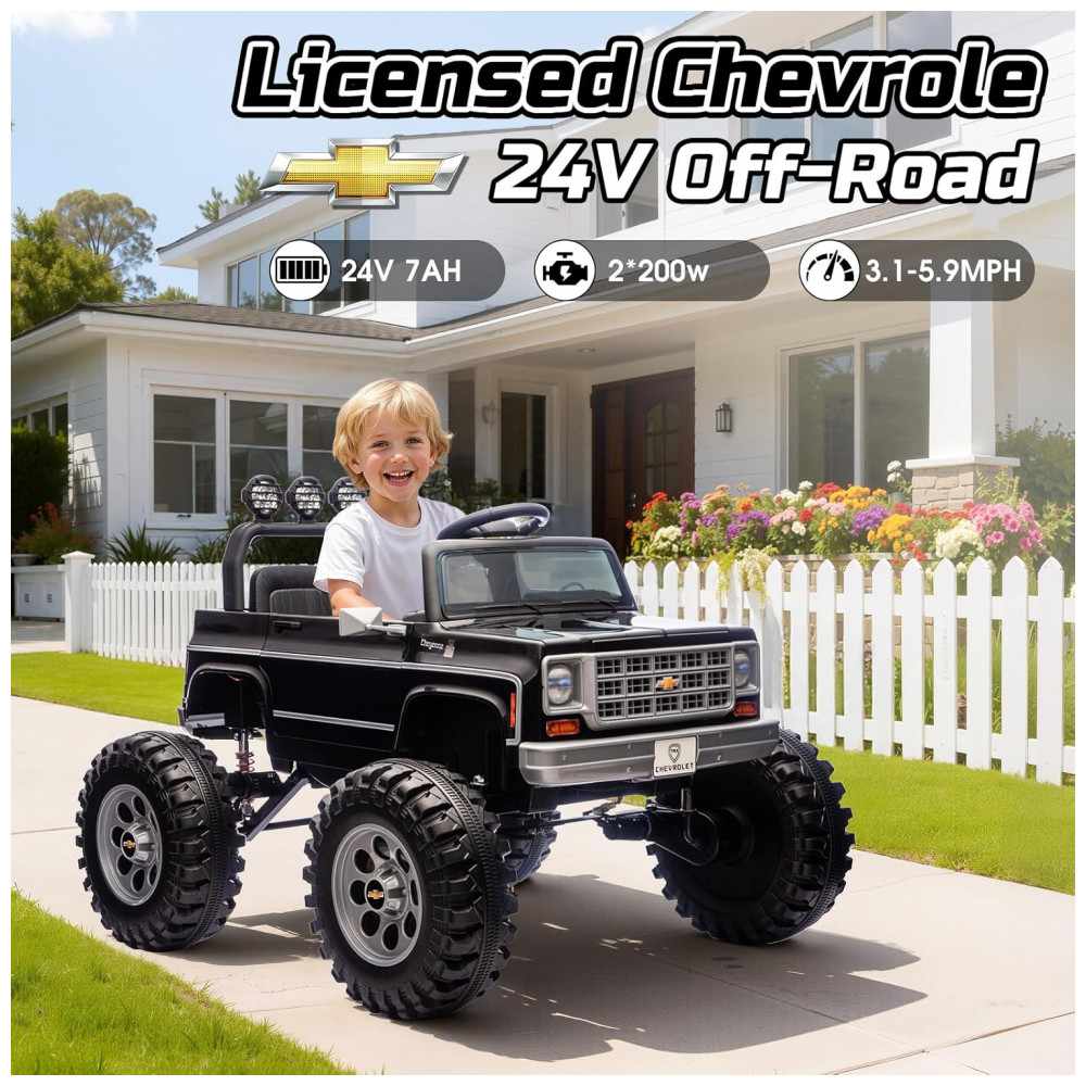 O carrinho elétrico licenciado Chevrolet Cheyenne 24V da MUKIDY é uma réplica fiel em escala real, apresentando design vintage com detalhes realistas como sons autênticos de motor e assento extra largo de 20 polegadas, ideal para acomodar duas crianças pequenas confortavelmente. Equipado com dois motores de 200W, oferece potência total de 400W para desempenho robusto em variados terrenos, possibilitando velocidades de até 5.9 mph com bateria recarregável de 24V que garante 1 a 2 horas de diversão contínua.